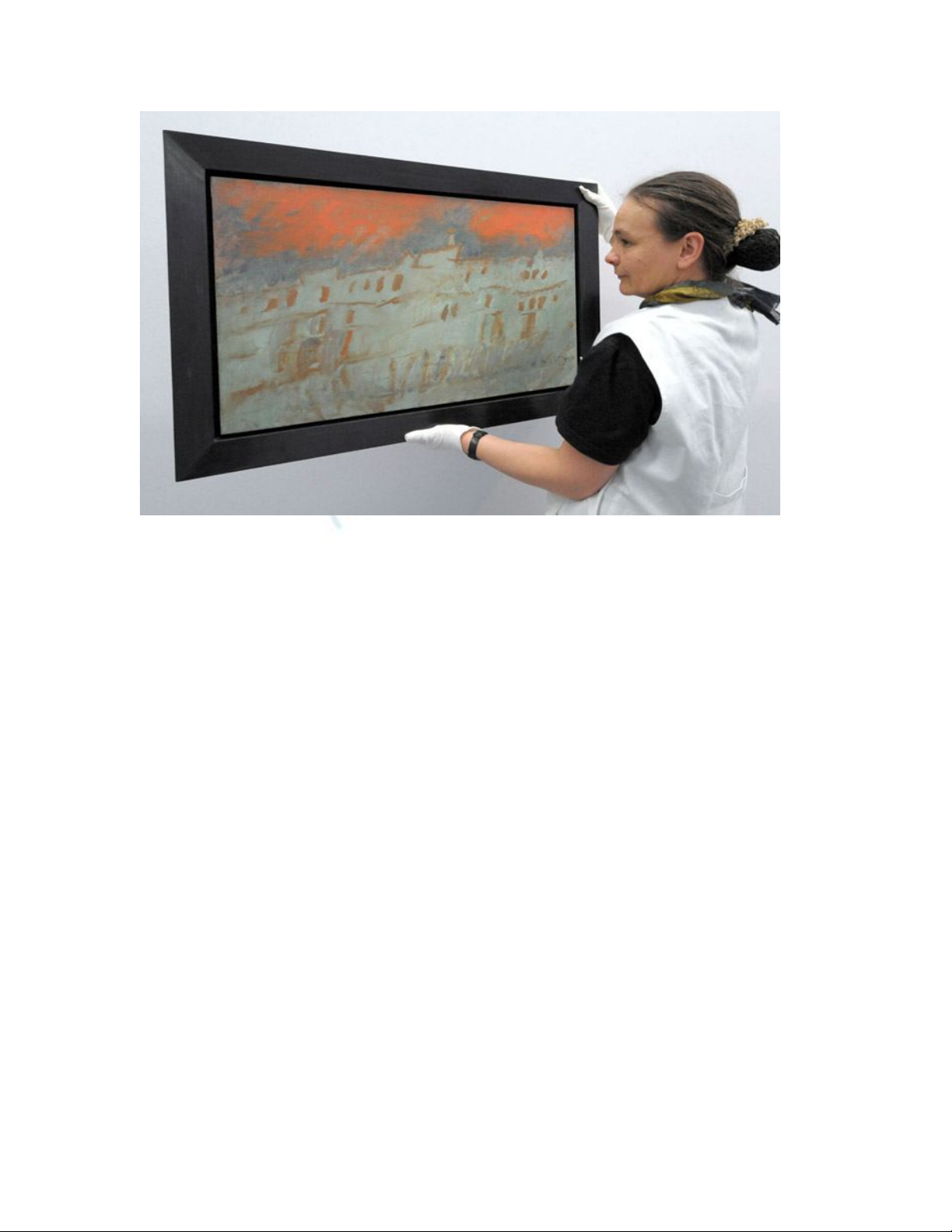 Trong ảnh: Nhà phục chế Karin Helene Haupt đang treo bức tranh 'The