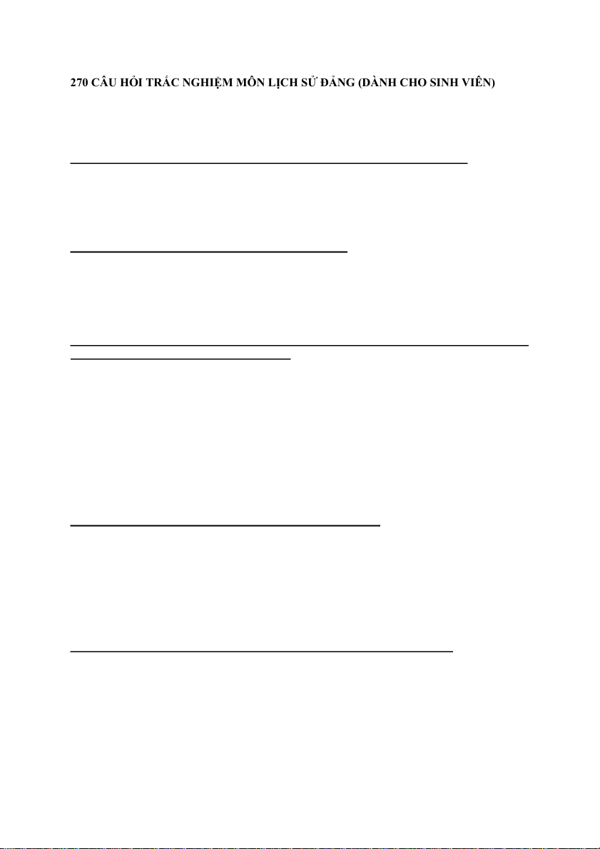 270 CÂU HỎI TRẮC NGHIỆM MÔN LỊCH SỬ ĐẢNG (DÀNH CHO SINH VIÊN)