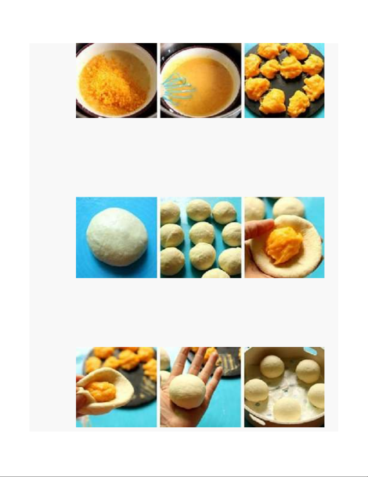 nhỏ bằng nhau, sau vo tròn, làm dẹp ra, cho nhân bánh vào và vo tròn lại.