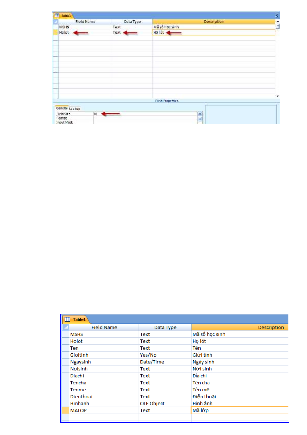 4. Nhấp Phím Tab , dấu nháy hiện ra tại Hàng thứ 2 Cột Field Name > Nhập Holot >