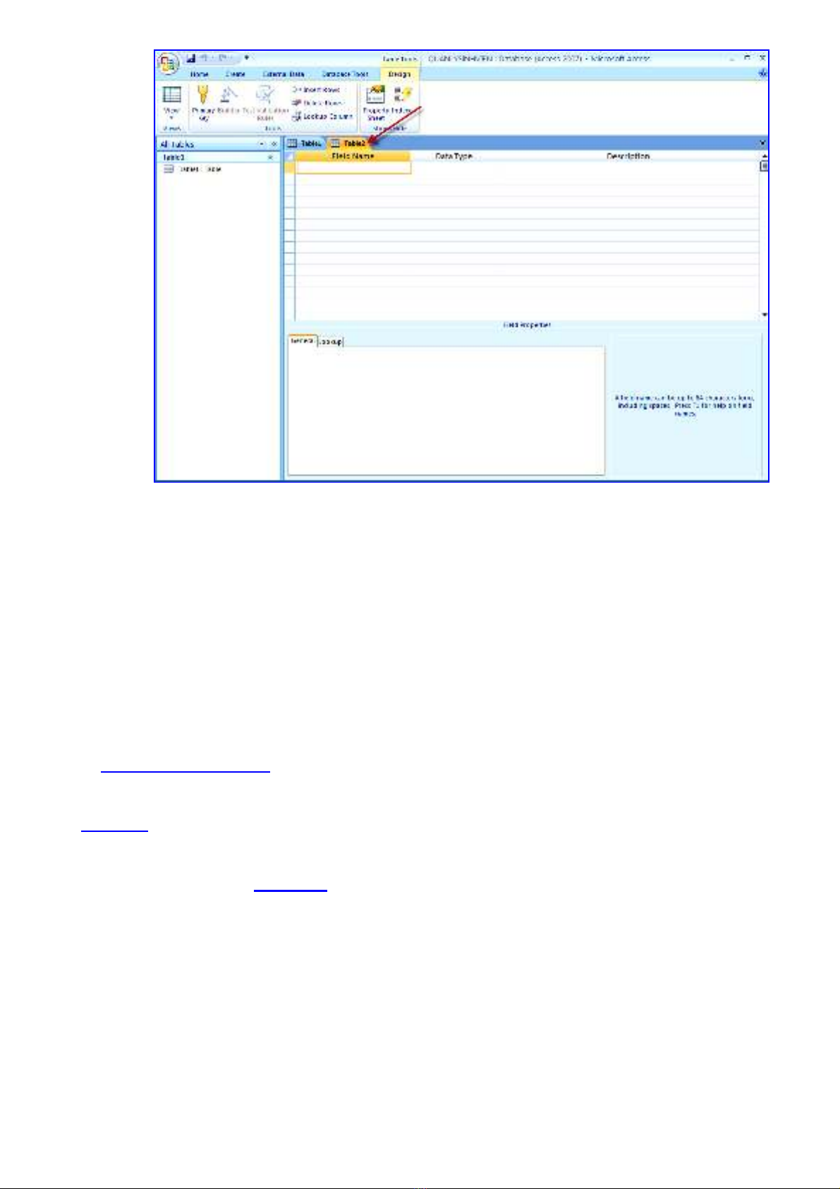 4. Nhấp Menu Create > Nhấp Table Design > Hiện ra Table2 với Cửa sổ kàm việc