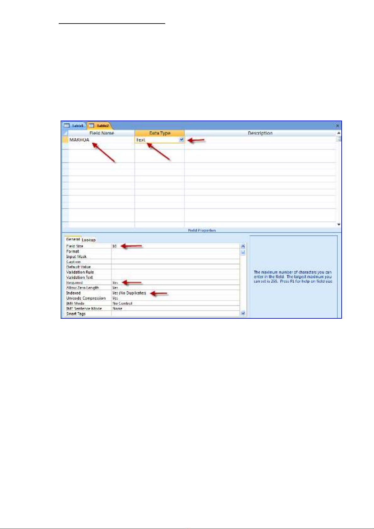 •Field thứ 1 tên :MAKHOA , dữ liệu của nó dạng TEXT , Độ rộng là 10 Ký tự .