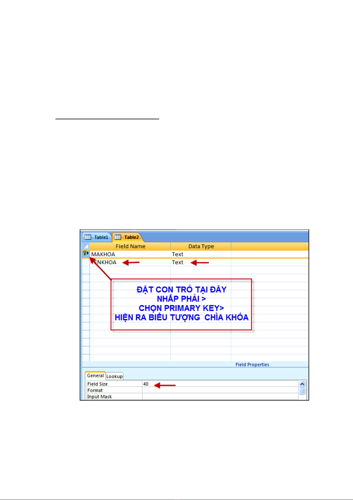 •Field thứ 2 tên :TENKHOA , dữ liệu của nó dạng TEXT , Độ rộng là 40 Ký tự .