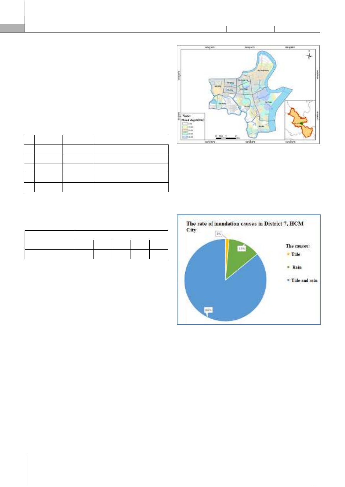 1,0 The complete damage. Source: [4] The threshold value of risk level is determined according to the Table 4 [4]. Table 4. Values of risk thresholds due to urban flooding Location Threshold values P/C (%) R1 R2 R3 R4 R5 District 7 21 39 60 78 100 Source: [4] 3. RESULTS AND DISCUSSION The survey results show that the area of District 7 is not only deeply flooded at roads such as Tran Xuan Soan, Huynh Tan Phat, but also deeply in roads such as Pham Huu Lau, Go O Mai, and Chuyen Dung Chinh. There are also typical flooded locations such as the section Le Van Luong assigned Nguyen Van Linh; Although Go O Mai and Phu Thuan intersect with Huynh Tan Phat, although these points are not flooded for a long time, they are the main roads affecting people in the area. 3.1. Summary of flood survey results and flood zoning The results from more than 70 survey questionnaires through the inundation depth parameters for 2021 - 2022 show that the average depth of flooding is about 23.38cm and the maximum depth of flooding about 45cm. Most of the surveyed areas have mild flooding frequency corresponding to 18 floods causing damage in a year. Inundated areas are identified and zoned according to the degree of depth shown in the map below (See Figure 3). Figure 3. Flood situation map in District 7, HCMC in 2021 - 2022 In addition, the during survey of current urban flooding in District 7, the problem of flood causes was also surveyed. Due to the location of District 7 surrounded by rivers and large canals, there is a high density of canals inside District 7, so the causes of flooding here are mainly tidal combined with rain (See Figure 4). Figure 4. The graph shows the percentage of causes of flooding in District 7, HCMC 3.2. Flooding often occurs in District 7 The damage to households is still inevitable. To determine the extent of damage caused by urban flooding is based on the analysing on damage types for each surveyed household. The extent of damage will be calculated based on the sum of two direct and indirect damages caused to households. There are two types of damages caused by flooding such as: - Direct damages include repair costs, clean-up costs, costs incurred due to traffic jams, business loss costs and other costs directly incurred by urban flooding.