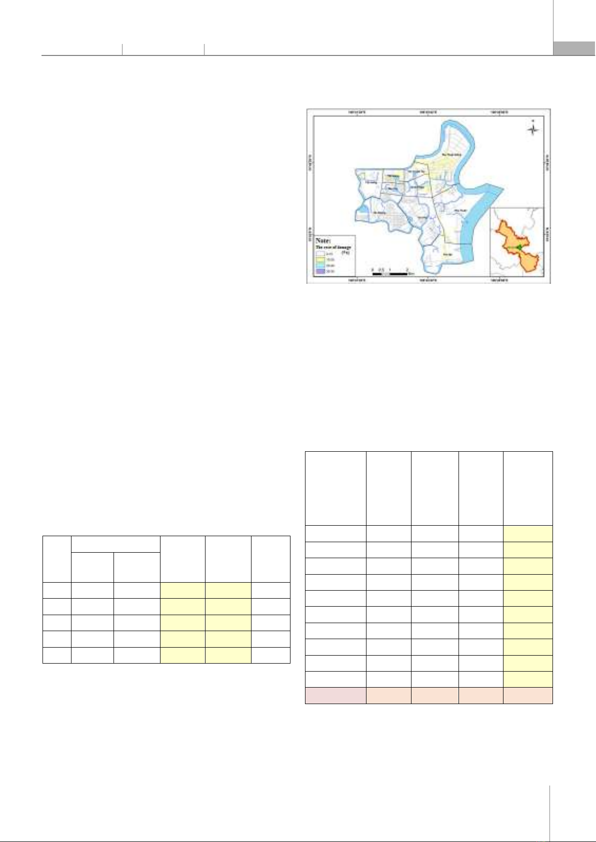 Light ooding frequency % (PLight) Middle ooding frequency % (PMiddle) Hard ooding frequency % (PHard) General ooding frequency (P%) Tan Hung 62.9 18.5 18.5 12.1 Tan Kieng 56.2 31.2 12.5 11.4 Tan Thuan Tay 48.4 29.6 21.8 13.3 Tan Phong 61.9 28.5 9.5 10.7 Tan Quy 66.6 16.6 16.6 11.6 Binh Thuan 52.6 33.3 14.0 11.8 Tan Phu 68.4 18.0 13.5 11.1 Phu My 51.8 30.7 17.3 12.4 Phu Thuan 49.5 33.1 17.3 12.5 Tan Thuan Dong 63.6 26.0 10.3 10.8 District 7 58.2 26.5 15.1 11.8 Besides, from the calculation of the damage rate for each household in District 7, the average of the damage rate for each ward in the district is calculated (See Table 7).