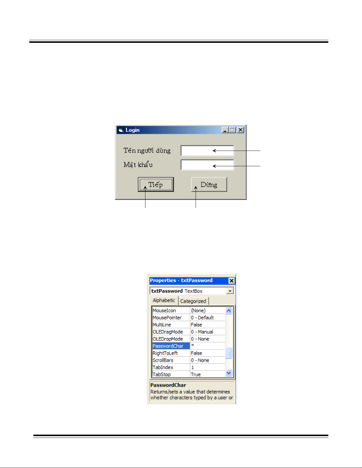 3. Ñt thuc tính PasswordChar ca ñoái ôïng txtPassword l *