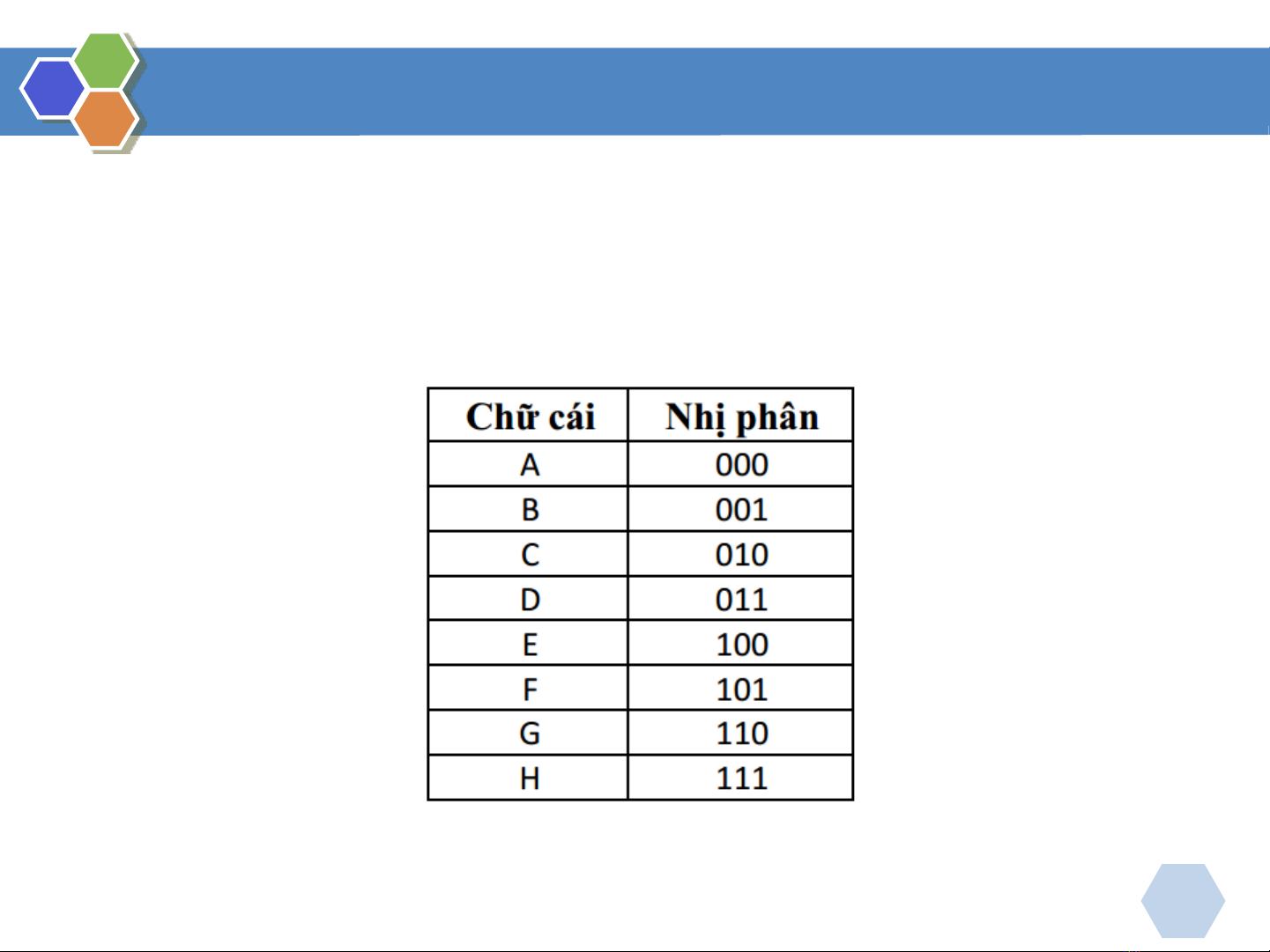 B, C, D, E, F, G, H trong đó mỗi chữ cái được biểu diễn bằng 3