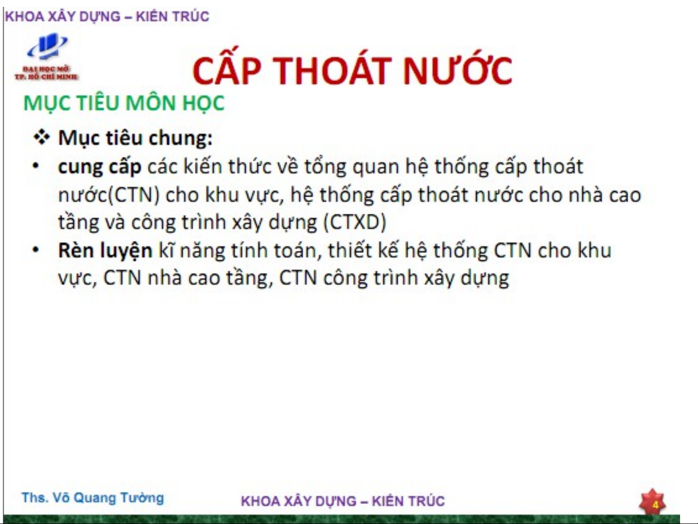 Bài giảng cung cấp cho người học các kiến thức: Hệ thống cấp nước, tiêu chuẩn và chế độ dùng nước, xác định các thông số,... Hi vọng đây sẽ là một tài liệu hữu ích dành cho các bạn sinh viên đang theo học môn dùng làm tài liệu học tập và nghiên cứu.