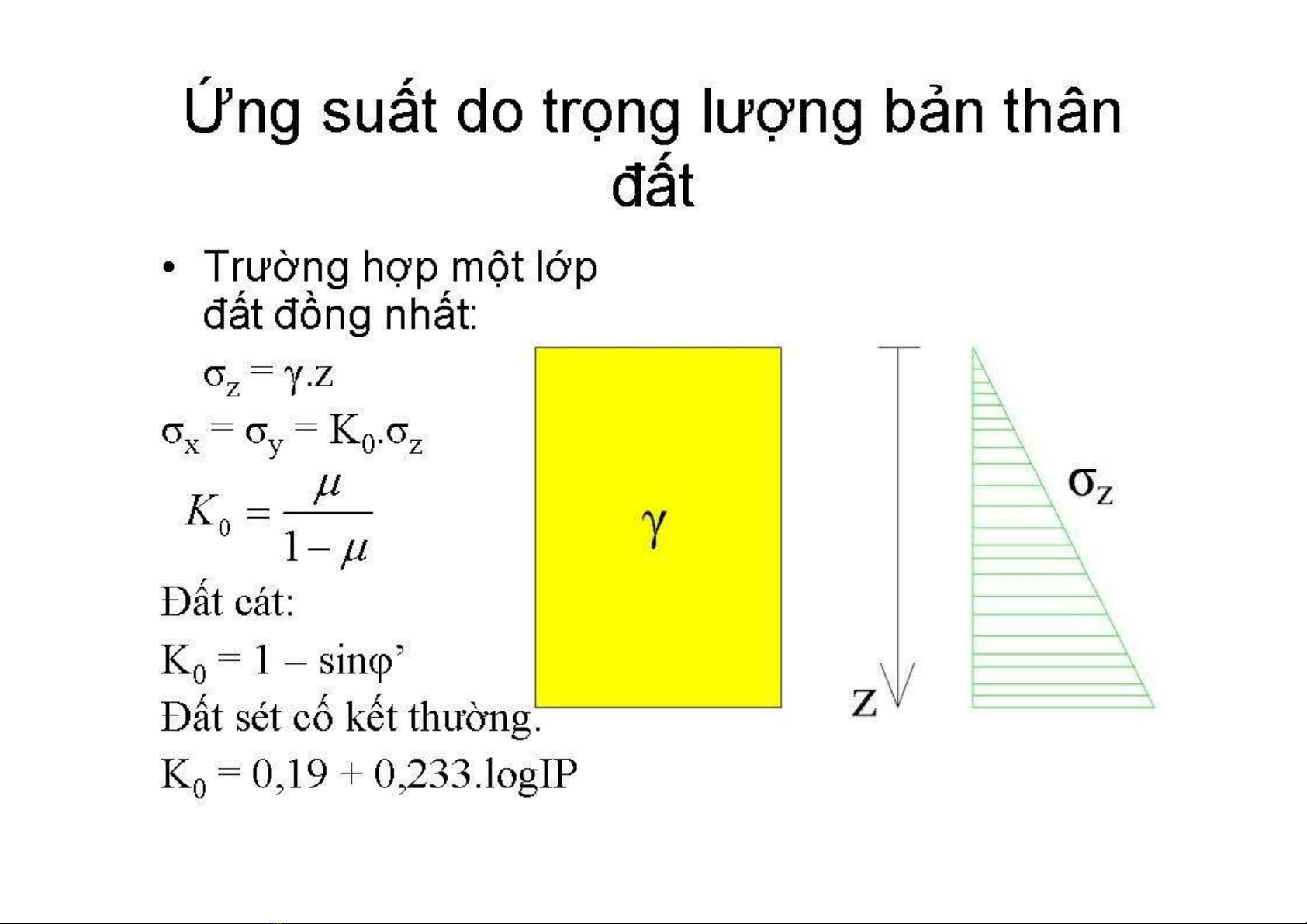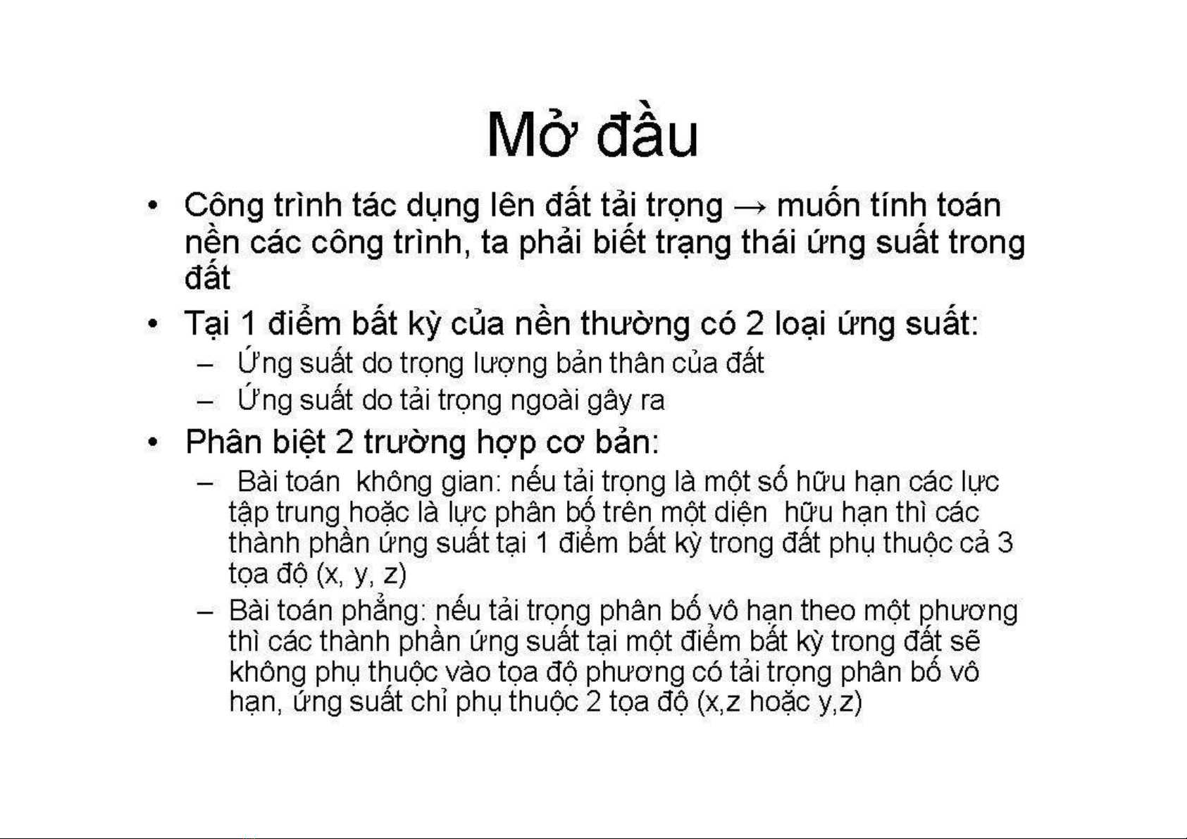 Chương 3. Ứng suất trong khối đất - Công trình tác dụng lên đất tải trọng - muốn tính toán nền các công trình, ta phải biết trạng thái ứng suất trong đất. Đất là một vật thể biến dạng tuyến tính, ta áp dụng những kết quả của lý thuyết đà hồi để tính ứng suất trong nền đất