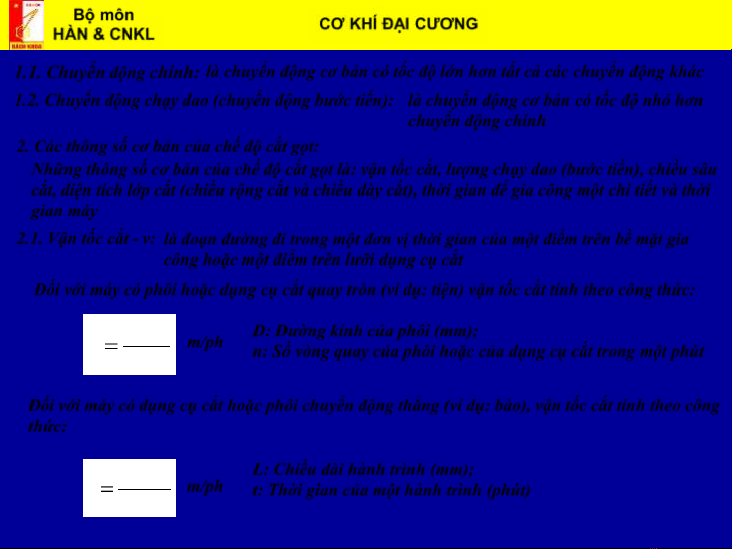 Đối với máy có dụng cụ cắt hoặc phôi chuyển động thẳng (ví dụ: bào), vận tốc cắt tính theo công