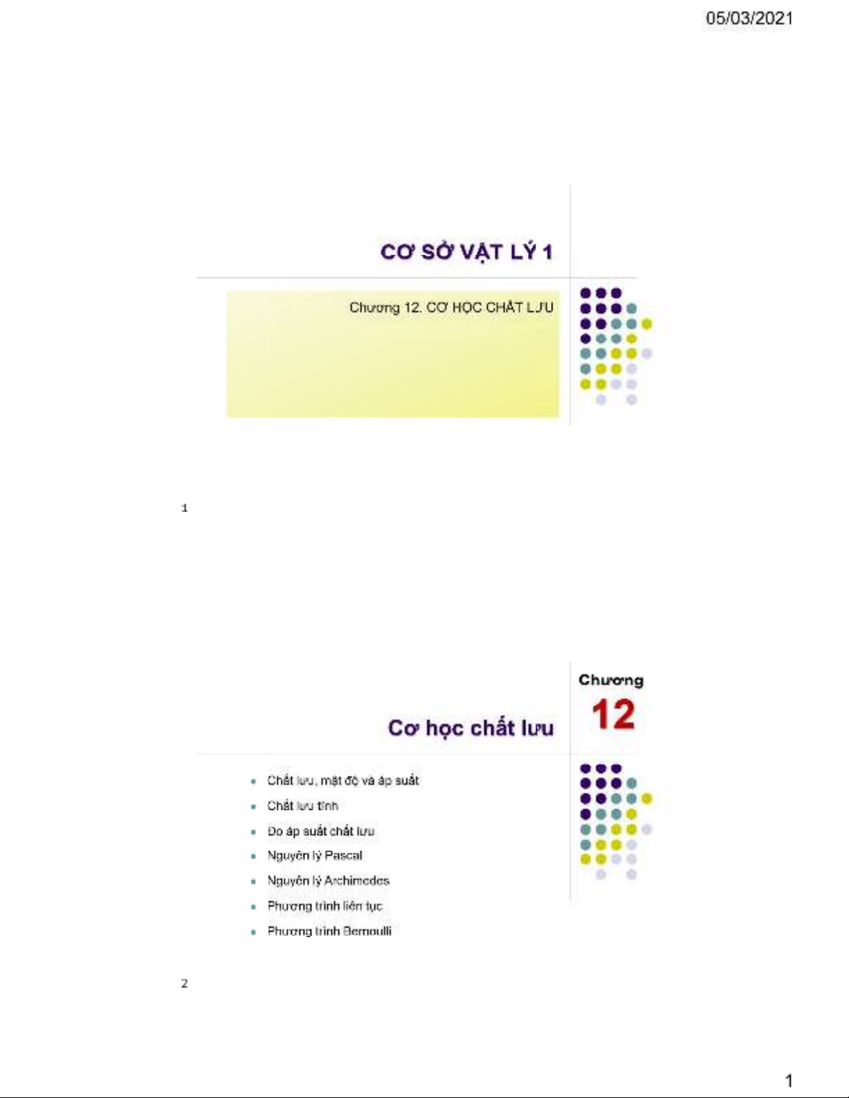 Bài giảng Cơ sở vật lý 1 - Chương 12 Cơ học chất lưu, cung cấp cho người học những kiến thức như: chất lưu, mật độ và áp suất; chất lưu tĩnh; đo áp suất chất lưu; nguyên lý Pascal; nguyên lý Archimedes; phương trình liên tục; phương trình Bernoulli