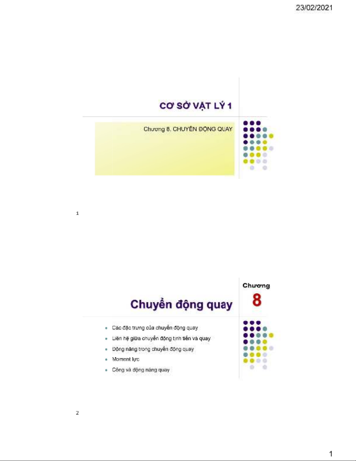 Bài giảng Cơ sở vật lý 1 - Chương 8 Chuyển động quay, cung cấp cho người học những kiến thức như: các đặc trưng của chuyển động quay; liên hệ giữa chuyển động tịnh tiến và quay; động năng trong chuyển động quay; moment lực; công và động năng quay. Mời các bạn cùng tham khảo!