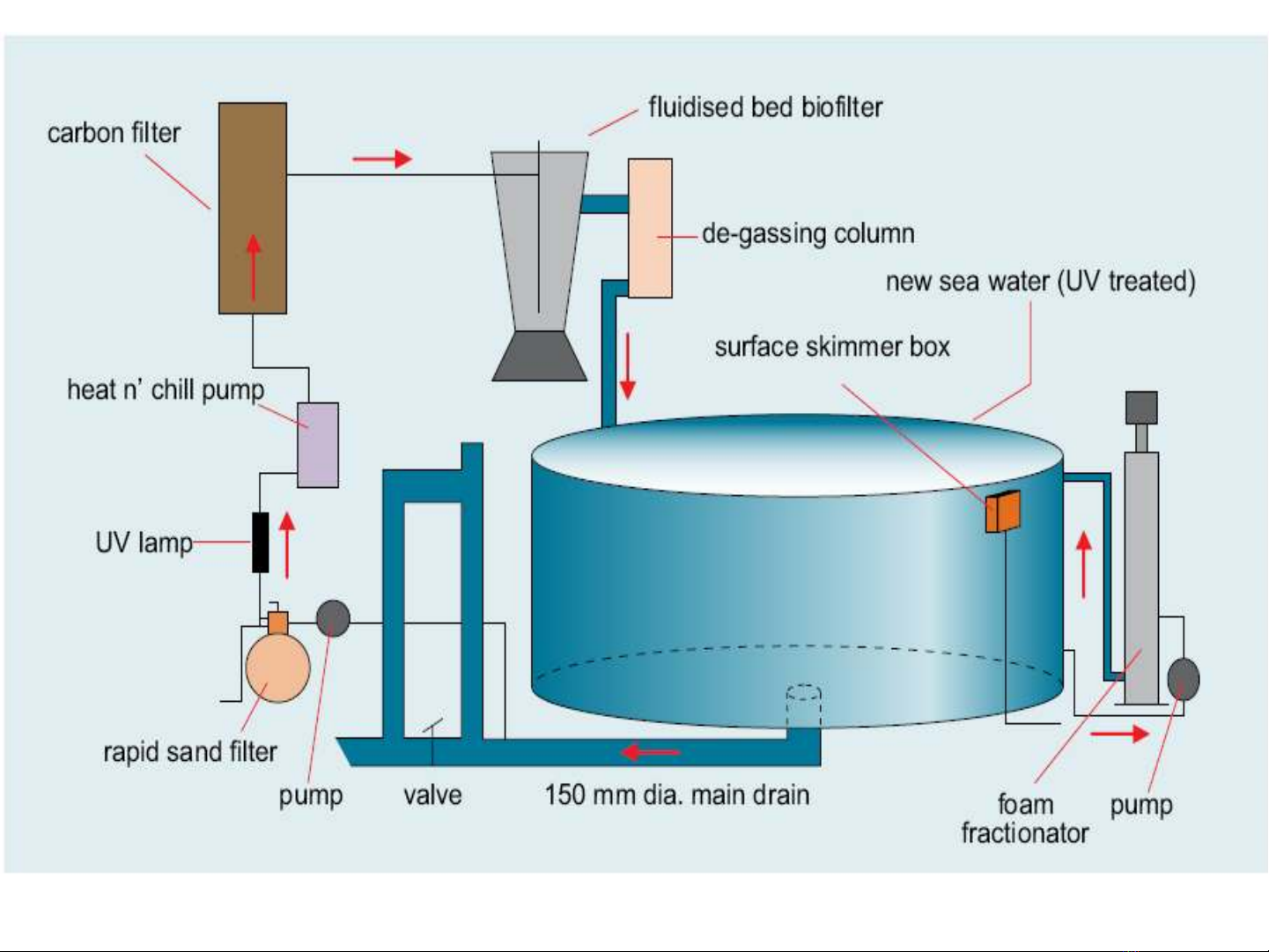 Submerged biofilter (3 compartments) Protein skimmer Rearing tank (4 tanks)