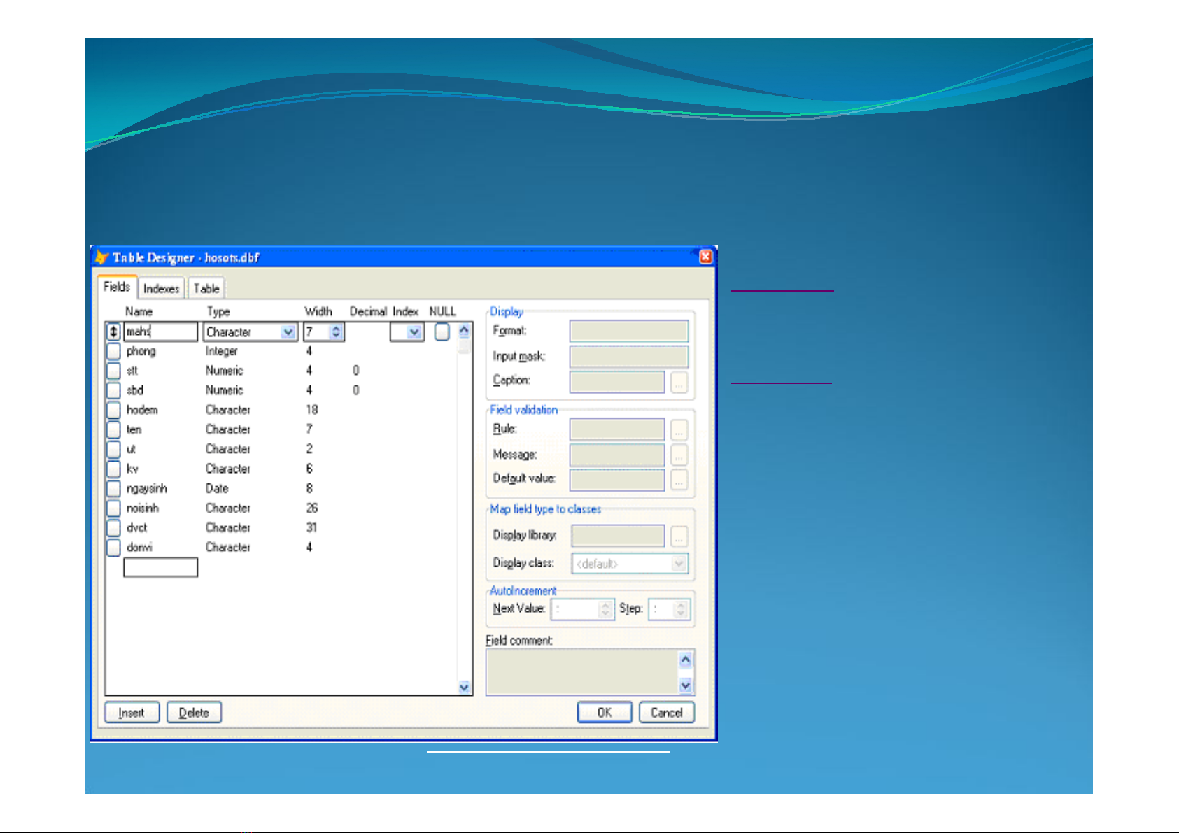 Lệnh sẽ cho hiển thị cấu trúc của tệp CSDL đang mở lên màn hình. Nếu có