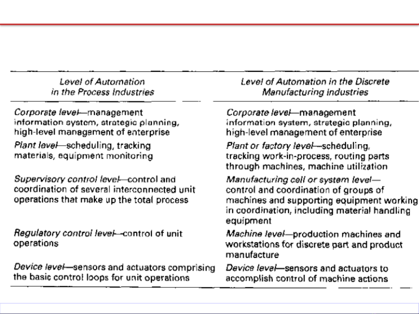 Một số công việc theo các cấp độ tự động hóa trong sản xuất