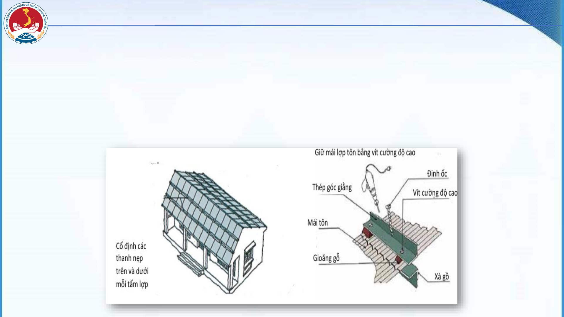 Đối với mái tôn: Đặt lên mái các thanh nẹp cách nhau khoảng từ 1,5 -2m tại mép chồng lên hai tấm tôn,