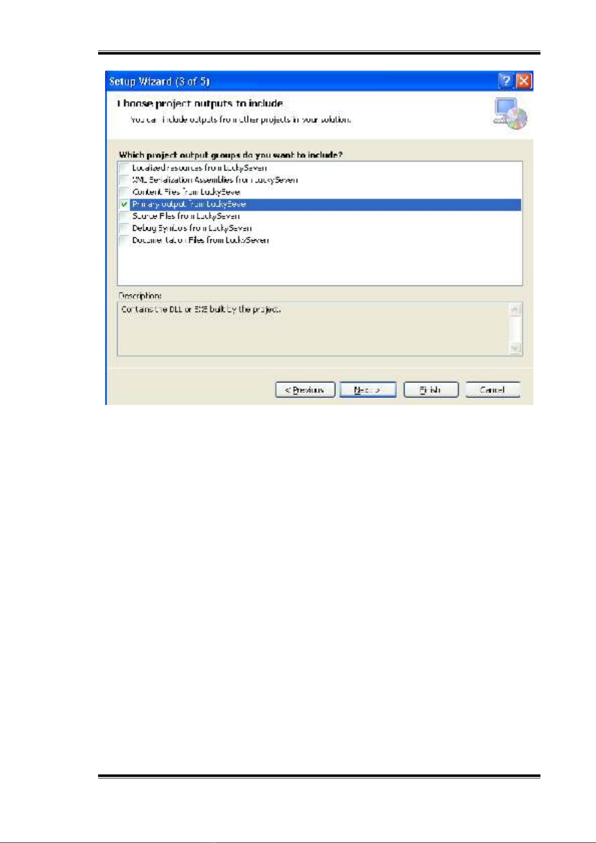 3. Nhấn nút Next. Hộp thoại Choose Project Output To Include hiển thị cho phép chỉ