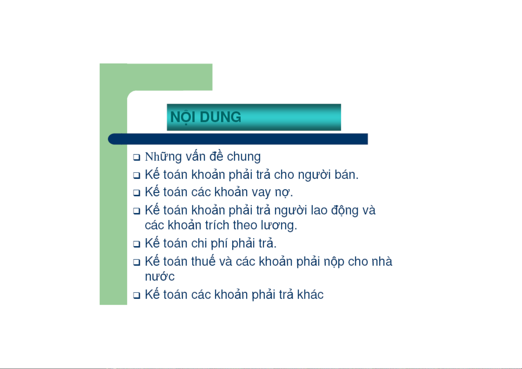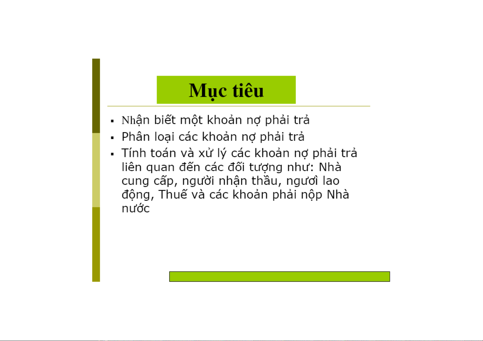 Mục tiêu của bài giảng Kế toán nợ phải trả nhằm giúp sinh viên nhận biết các khoản nợ phải trả, phân loại các khoản nợ phải trả, tính toán xử lý các khoản nợ phải trả.