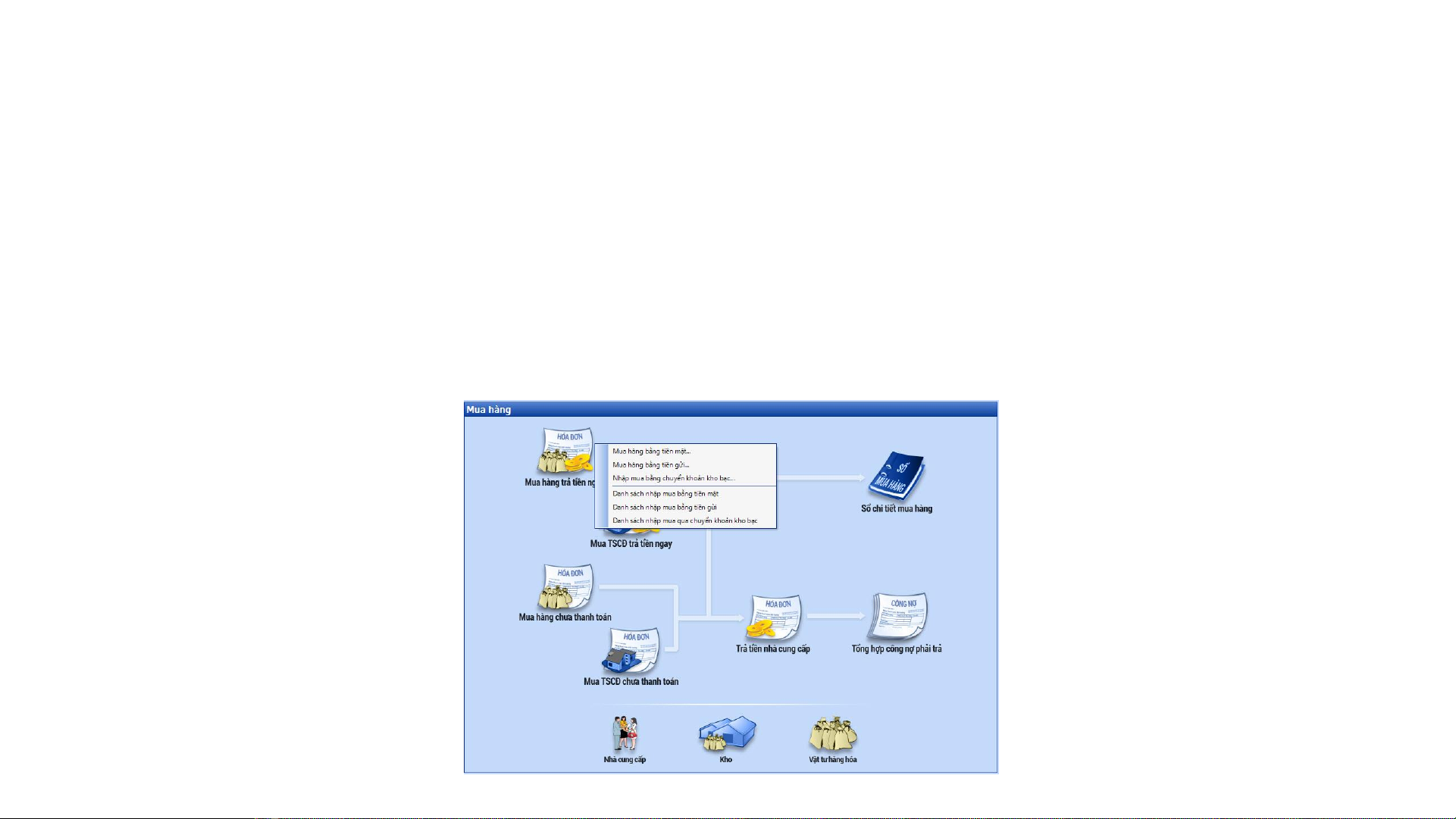 qua kho bằng tin mặt, tin gửi, chuyển khoản kho bạc hay mua hàng chưa