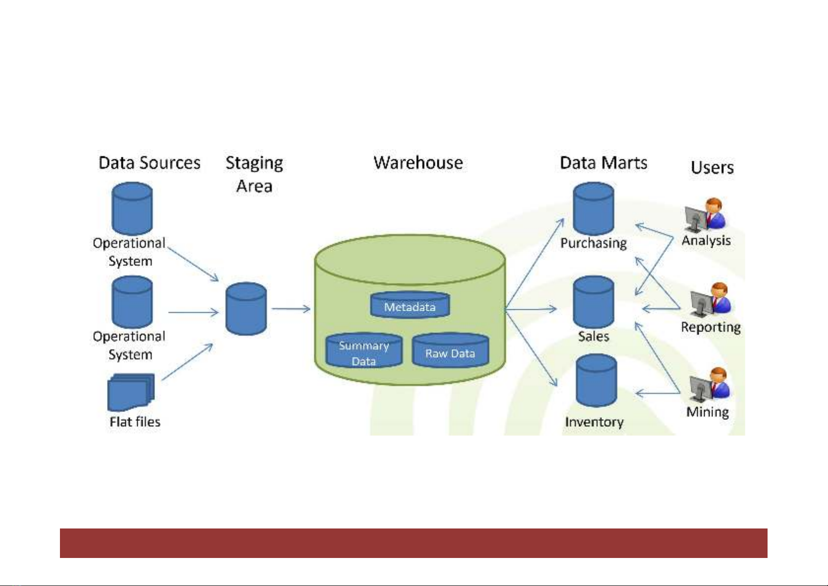 Bài giảng trình bày về các nội dung chính của kiến trúc kho dữ liệu (DW) cho doanh nghiệp. DW được chia thành bốn vùng: Nguồn dữ liệu hoạt động (ODS), Vùng Staging, Kho dữ liệu và Vùng thể hiện. ODS là nơi chứa các dữ liệu phục vụ hoạt động hàng ngày của doanh nghiệp, trong khi Vùng Staging là nơi chuẩn bị các bản copy của dữ liệu được tải vào từ ODS. Kho dữ liệu lưu trữ dữ liệu thô đã được làm sạch và dữ liệu dẫn xuất, trong khi Vùng thể hiện bao gồm Data Mart, công cụ lập báo cáo và xử lý phân tích. Bài giảng cũng giới thiệu về cách xây dựng một DW hoàn chỉnh, bao gồm phần cứng và kiến trúc luồng dữ liệu, cấu trúc kho lưu trữ và mô hình dữ liệu. Tiếp theo, đề tài giới thiệu về các kiến trúc trong thực tế, bao gồm kiến trúc 2 tầng và kiến trúc 3 tầng. Cuối cùng, bài giảng giới thiệu về các kiến trúc khác, bao gồm kiến trúc N tầng và kiến trúc dựa trên Web.
