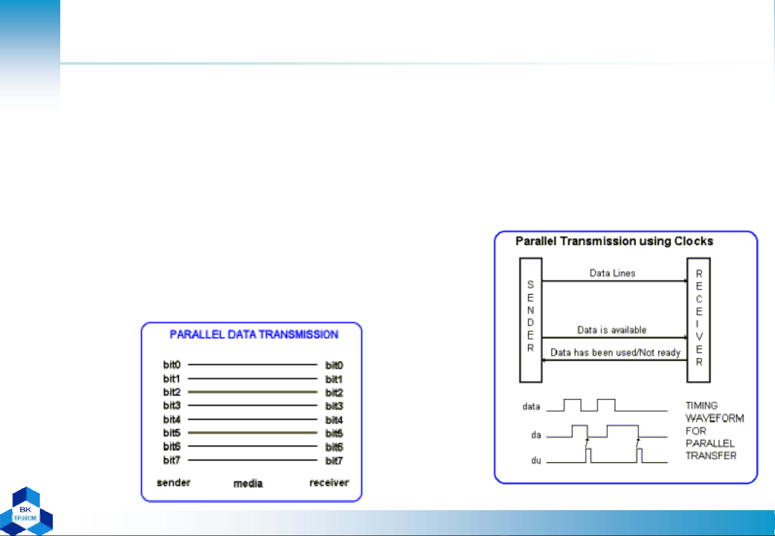 •Mỗi bit dùng một đường truyền riêng. Nếu có 8 bits được truyền