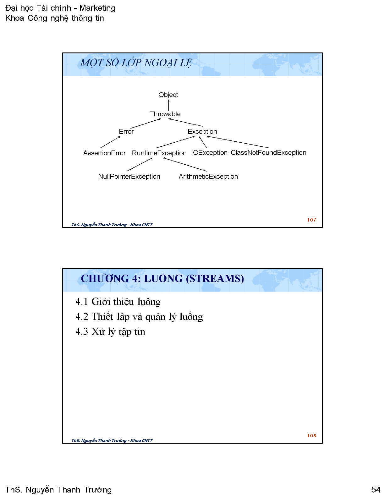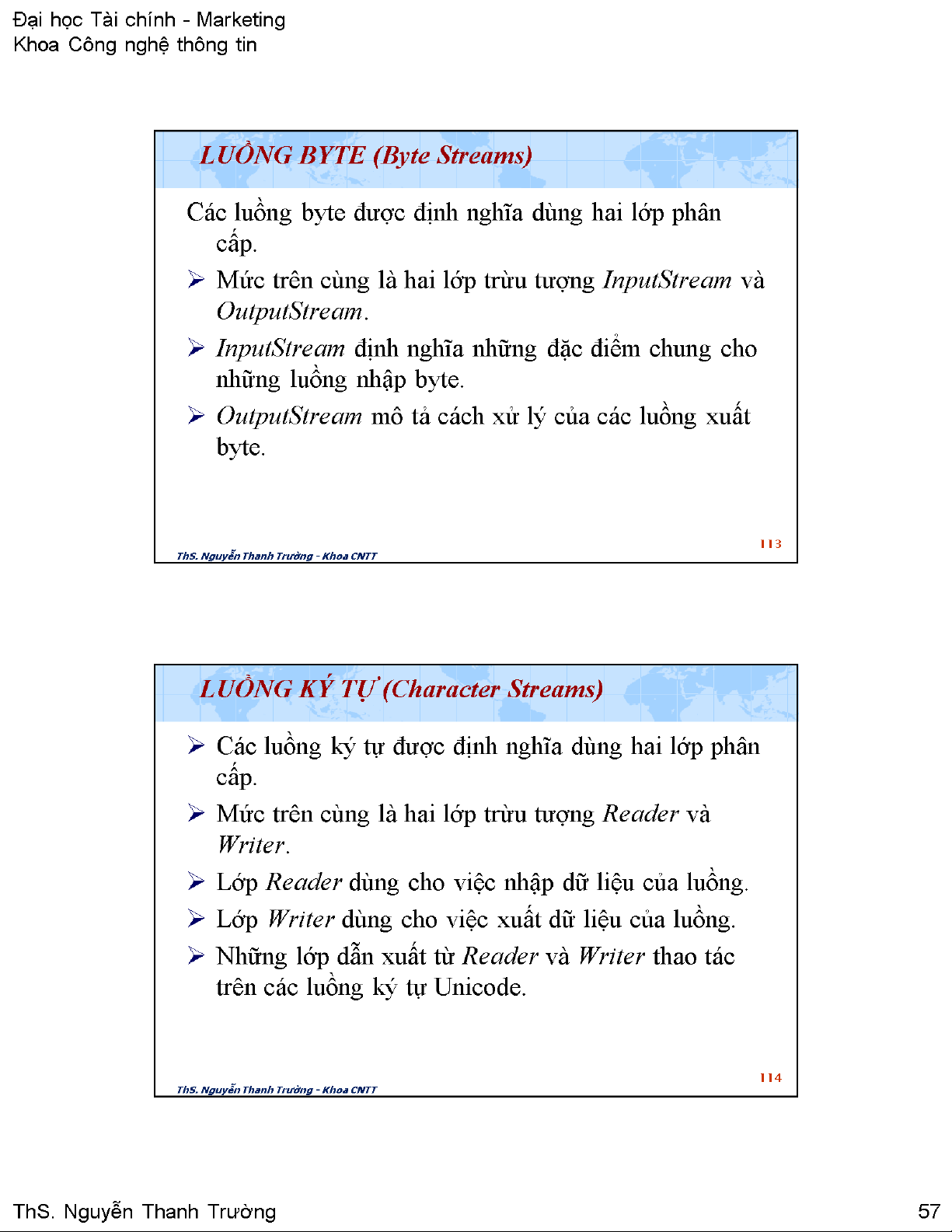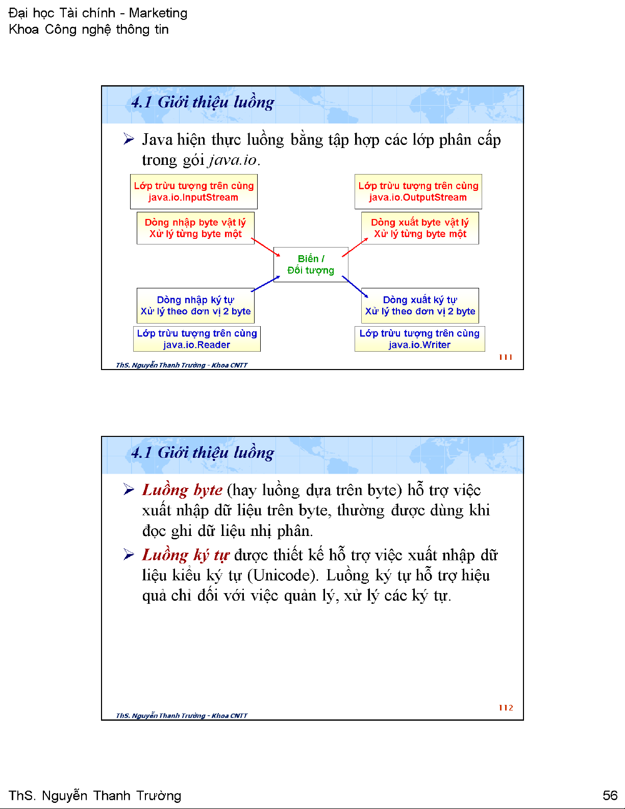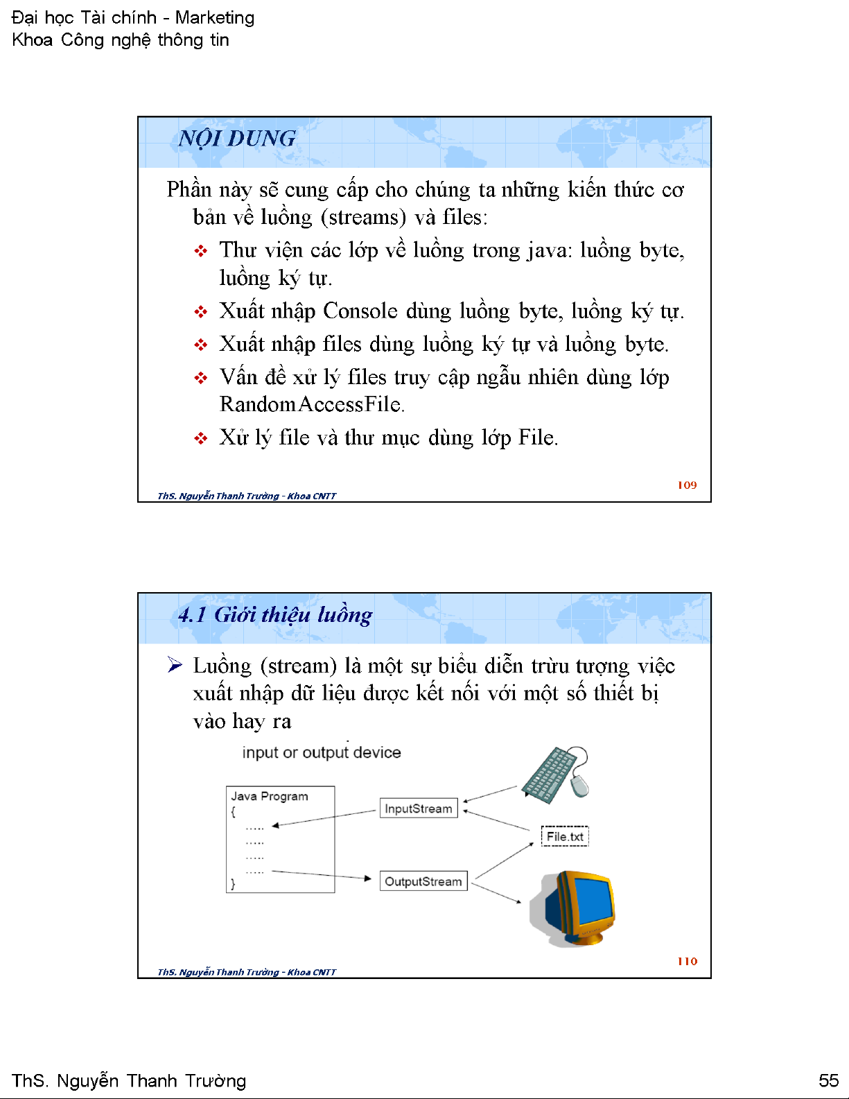 Tài liệu này cung cấp một cái nhìn toàn diện về cơ chế luồng (streams) trong Java, một thành phần cốt lõi của thư viện java.io để thực hiện các thao tác xuất nhập dữ liệu. Nội dung chính bắt đầu bằng việc giới thiệu các loại luồng cơ bản: luồng byte (Byte Streams) và luồng ký tự (Character Streams), cùng với các lớp trừu tượng tương ứng như InputStream, OutputStream, Reader và Writer. Mỗi loại luồng được giải thích chi tiết về mục đích và cách thức hoạt động, bao gồm cả cấu trúc phân cấp các lớp kế thừa như FileInputStream, FileOutputStream, BufferedReader, BufferedWriter, v.v. Tài liệu tiếp tục trình bày cách thiết lập và quản lý luồng, tập trung vào các phương thức quan trọng của InputStream và OutputStream, cùng với ví dụ minh họa cách đọc và ghi dữ liệu từ console bằng System.in và System.out. Phần quan trọng khác là hướng dẫn xử lý tệp tin (files) sử dụng luồng byte, bao gồm các bước mở, đọc, ghi và đóng tệp, cùng với việc xử lý các ngoại lệ như IOException và FileNotFoundException. Các ví dụ mã lệnh cụ thể được cung cấp để minh họa cách thực hiện các tác vụ này trong thực tế. Giá trị ứng dụng của tài liệu nằm ở việc trang bị kiến thức nền tảng vững chắc về Java I/O, giúp lập trình viên phát triển các ứng dụng có khả năng tương tác với dữ liệu bên ngoài một cách hiệu quả và an toàn, đặc biệt khi làm việc với lưu trữ tệp tin và giao tiếp console.