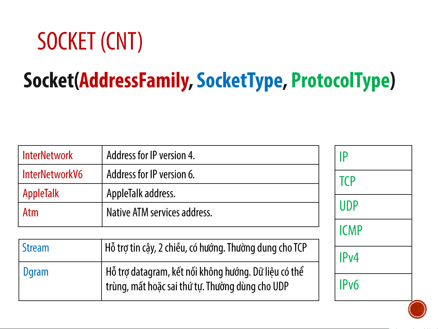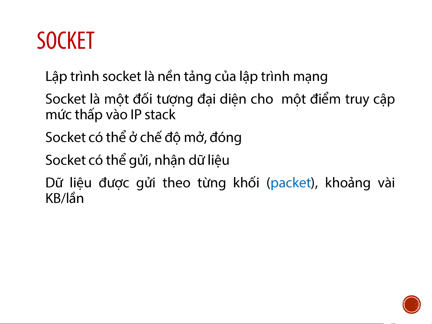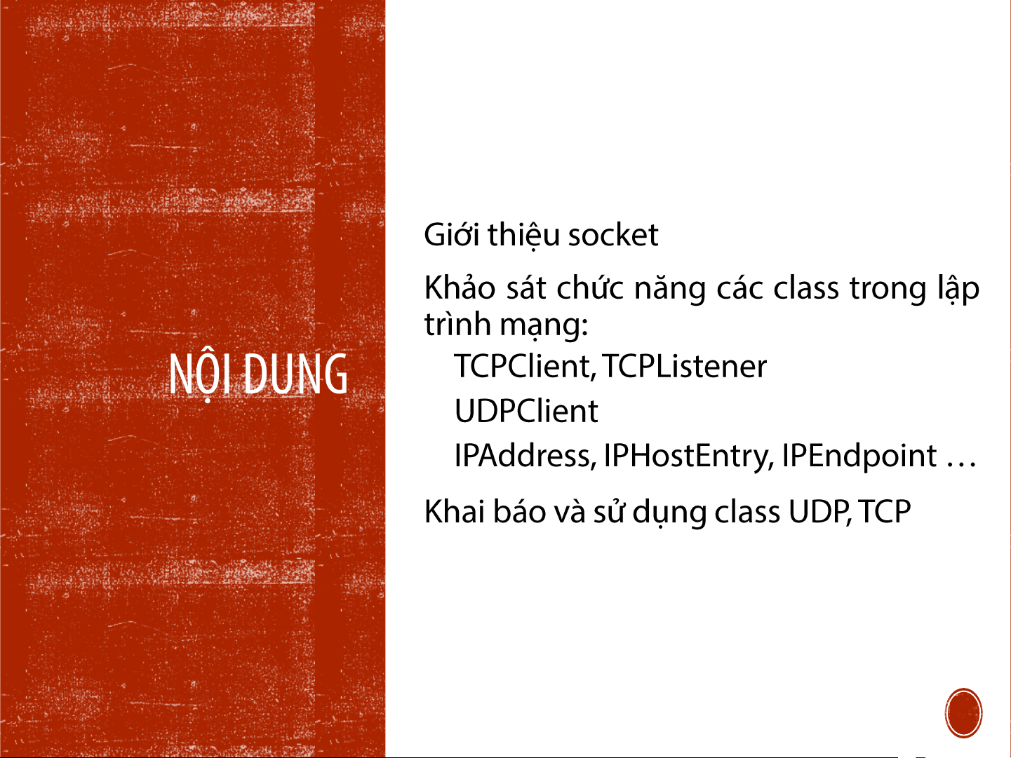 Chương này giới thiệu về lập trình socket, một nền tảng cơ bản trong lập trình mạng. Nội dung bao gồm các khái niệm cơ bản về socket, các class liên quan trong .NET Framework, và cách khai báo, sử dụng các class UDP và TCP để xây dựng các ứng dụng mạng.