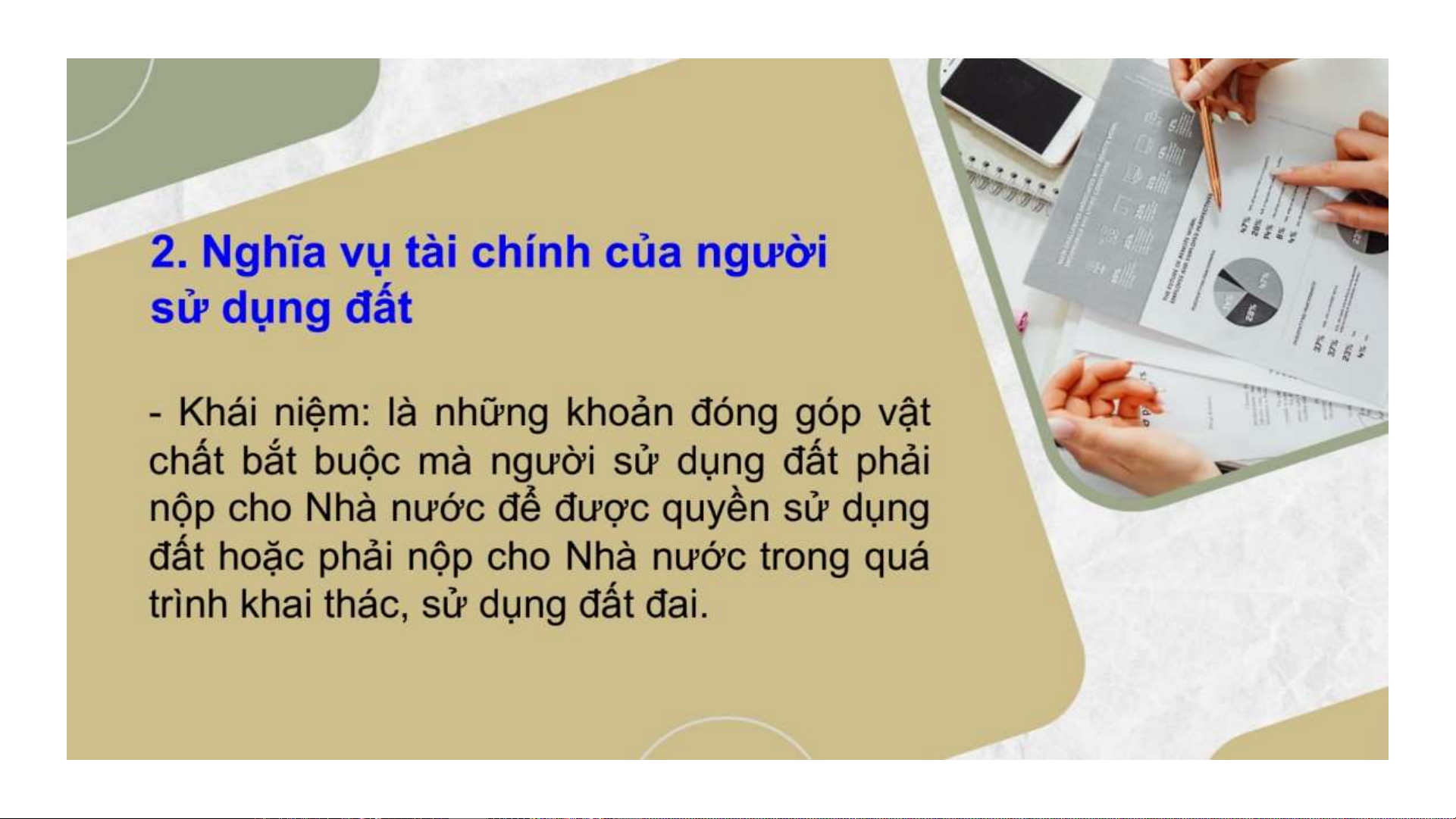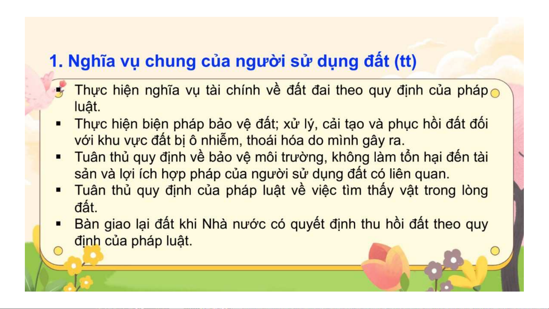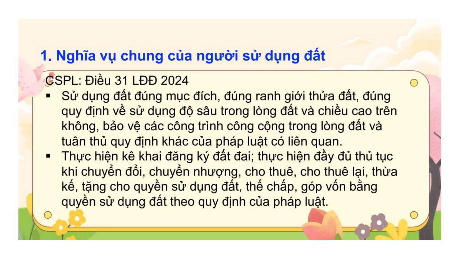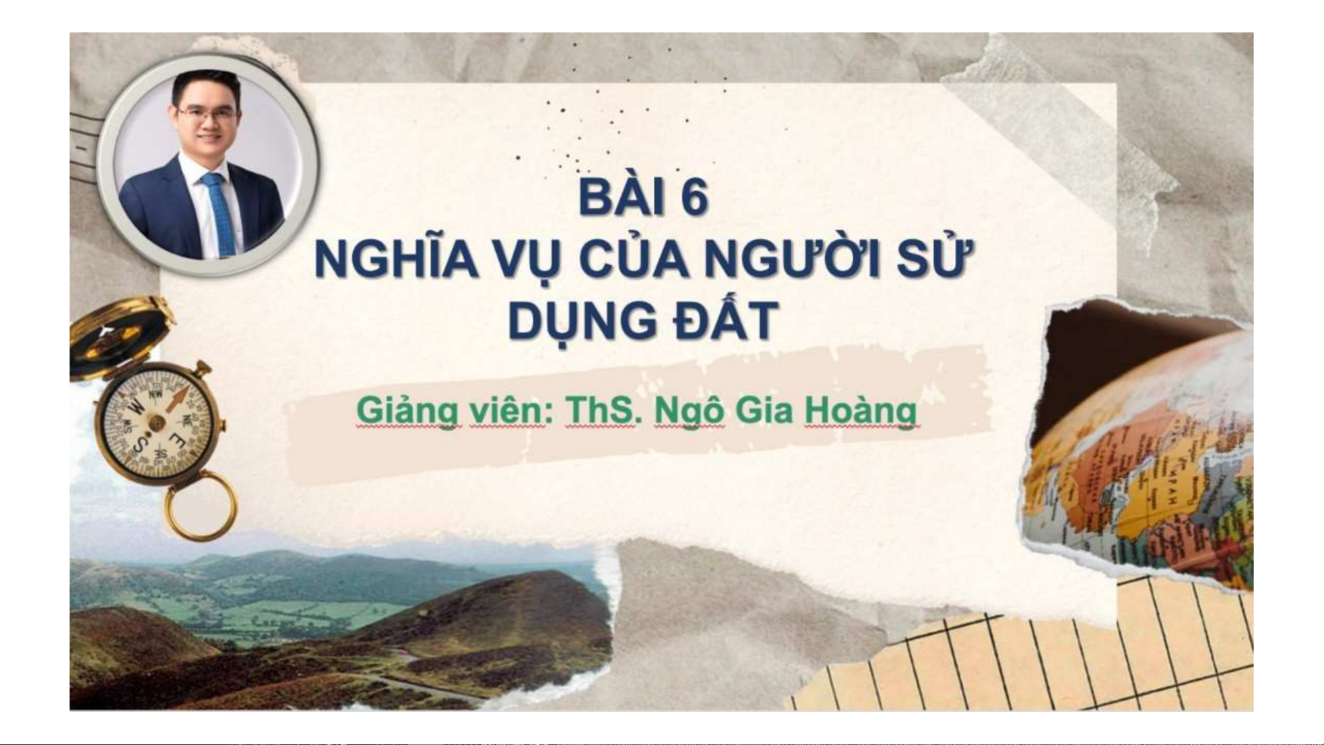 Bài giảng Luật Đất đai: Bài 6 về nghĩa vụ của người sử dụng đất theo Luật Đất đai 2024: nghĩa vụ chung (sử dụng đúng mục đích, đăng ký đất đai) và nghĩa vụ tài chính (tiền sử dụng đất, thuê đất).