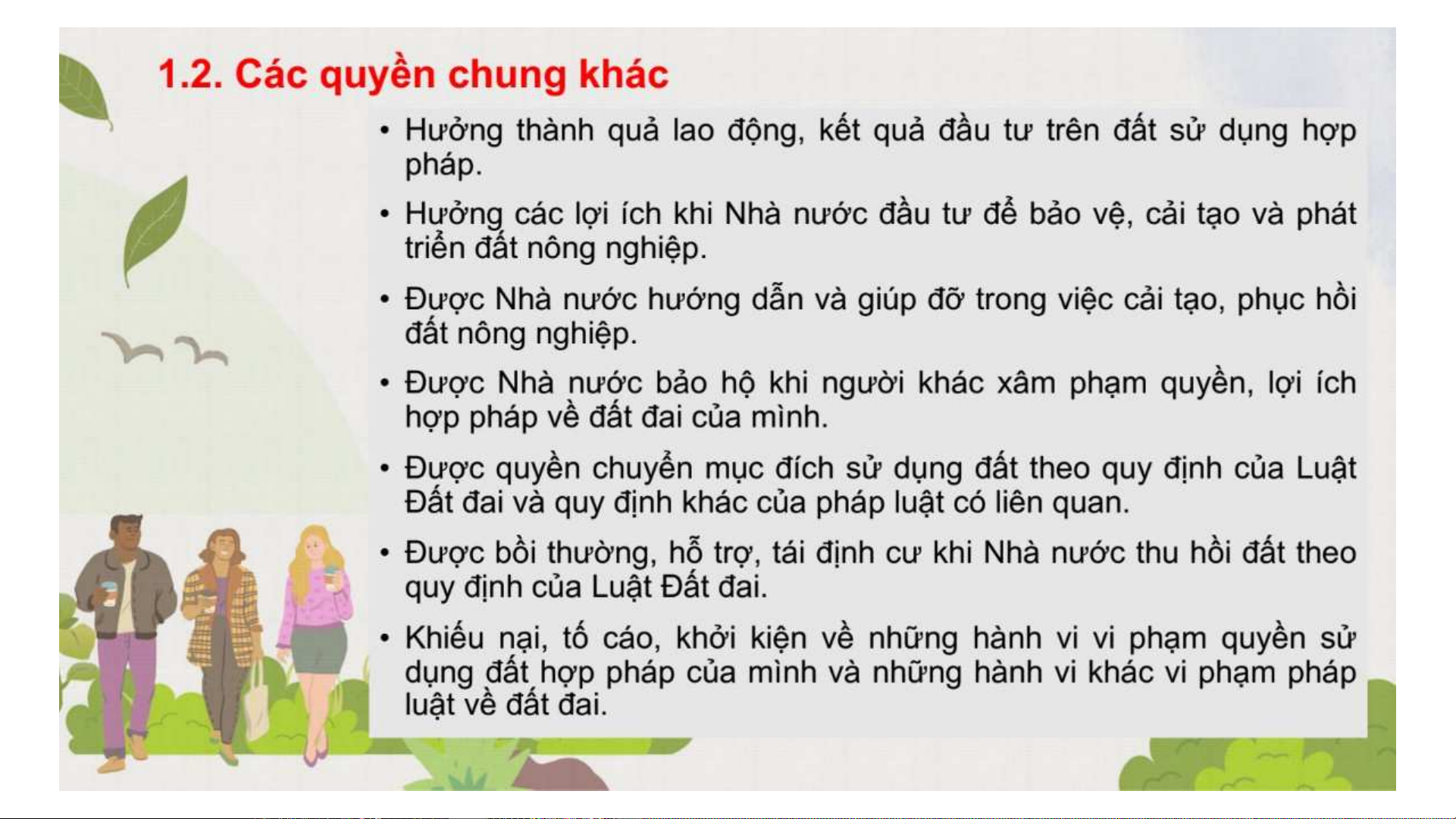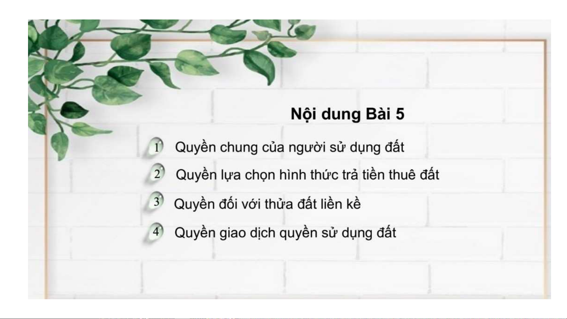 Bài giảng Luật Đất đai: Bài 5 về quyền của người sử dụng đất: quyền chung, chọn hình thức trả tiền thuê, quyền với đất liền kề và giao dịch.