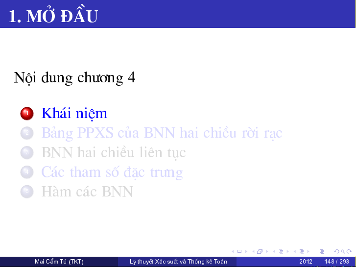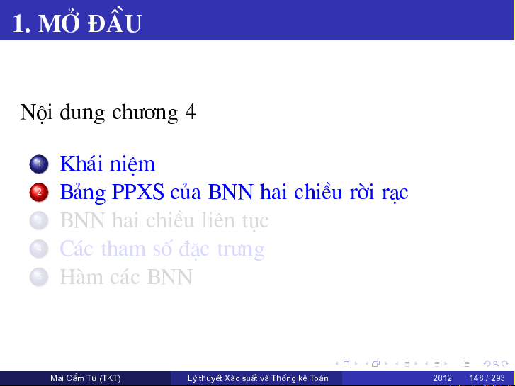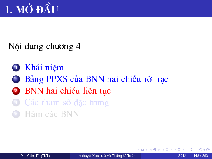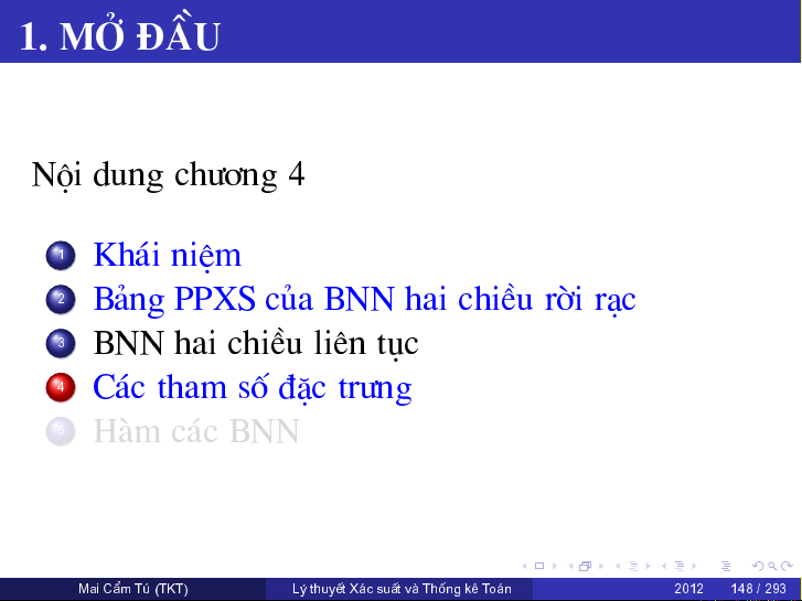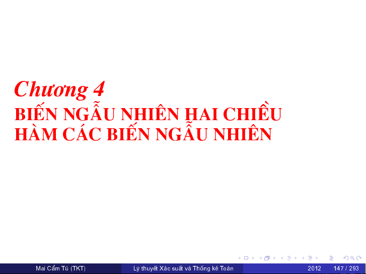 Chương 4 Biến ngẫu nhiên hai chiều hàm các biến ngẫu nhiên, nội dung trong chương 4 trình bày kiến thức về: Khái niệm, bảng phân phối xác suất của biến ngẫu nhiên hai chiều rời rạc, biến ngẫu nhiên hai hàm liên tục, các tham số đặc trưng, hàm các biến ngẫu nhiên.