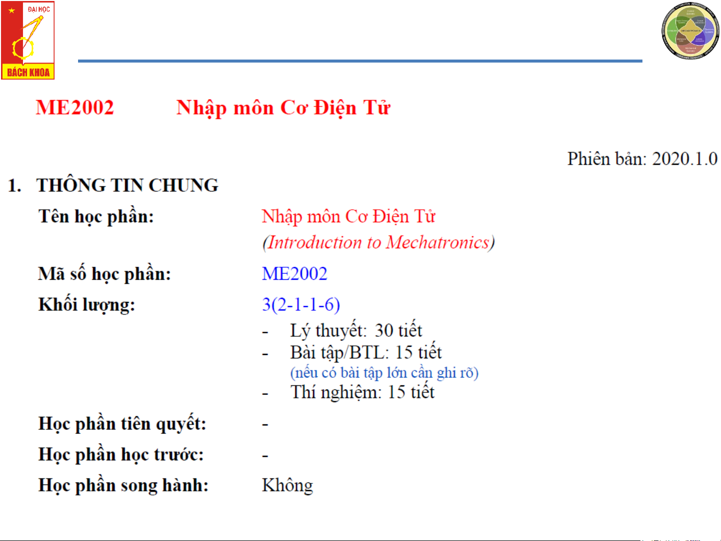 1. Giới thiệu về học phần Nhập môn Cơ điện tử (ME2002)