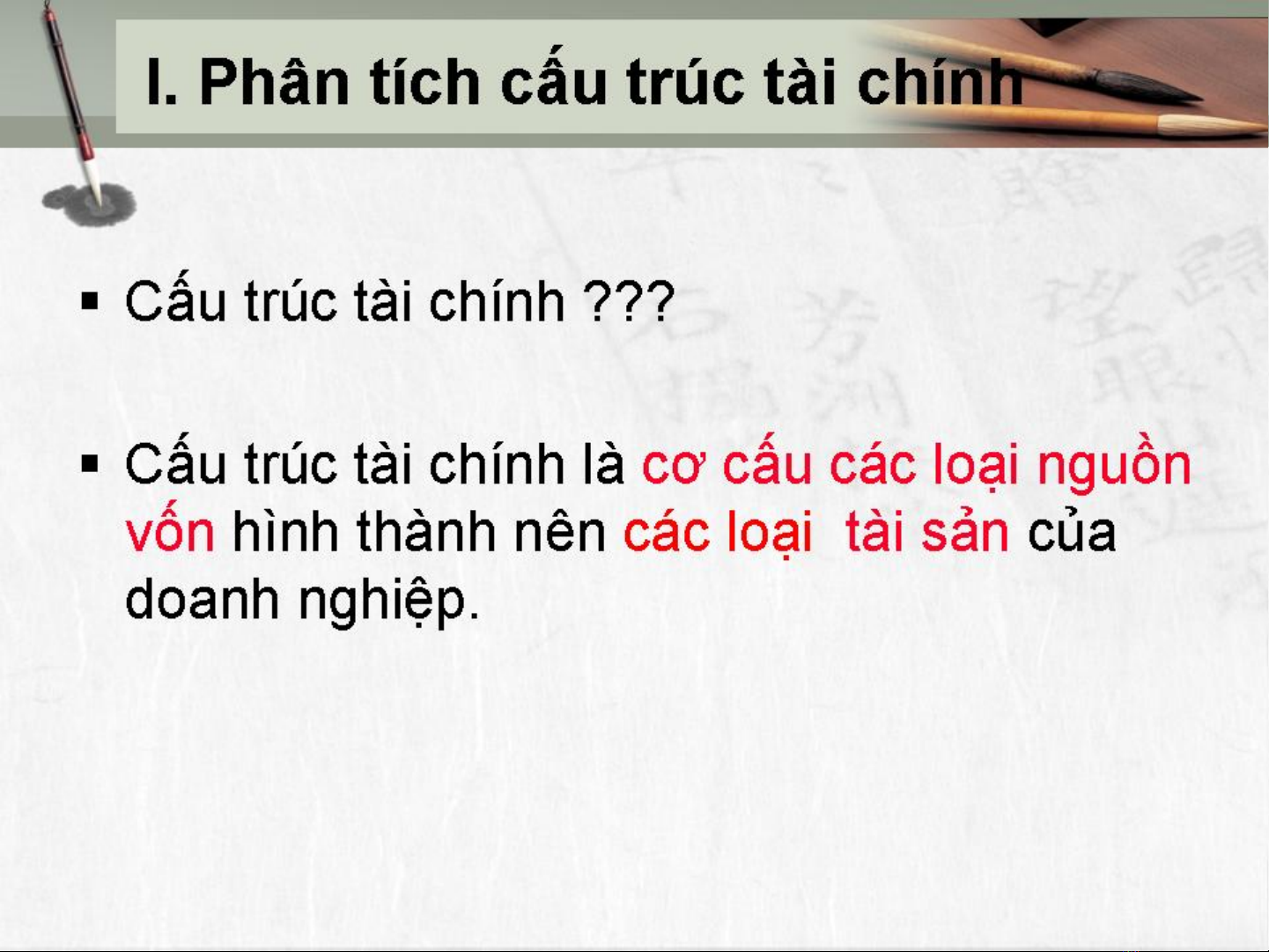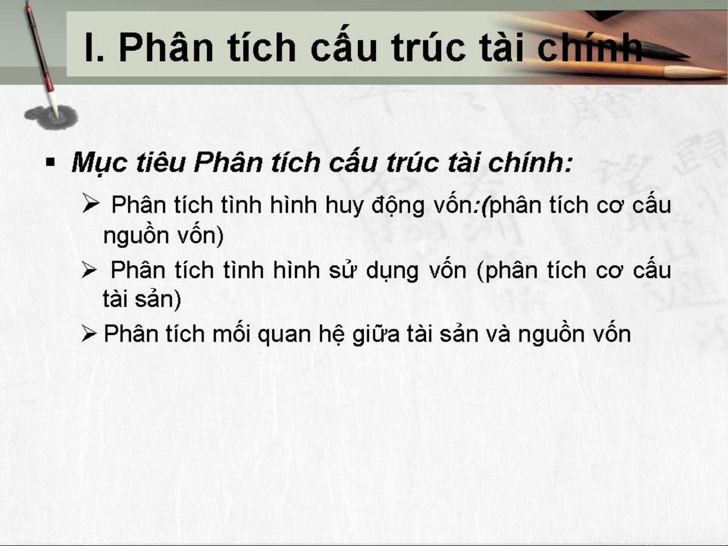 Bài giảng Phân tích báo cáo tài chính: Chương 3 Phân tích cấu trúc tài chính và tình hình bảo đảm nguồn vốn, cung cấp cho người học những kiến thức như Phân tích cơ cấu tài sản; phân tích tình hình bảo đảm vốn cho hoạt động kinh doanh. Mời các bạn cùng tham khảo!