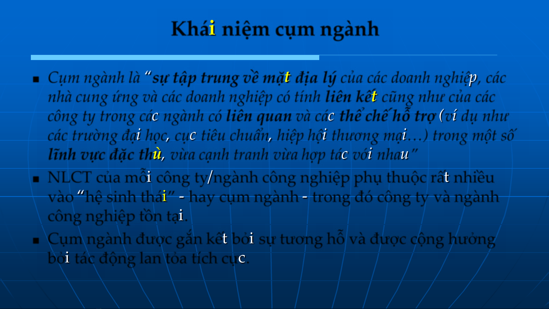 ◼Cụm ngành là “sự tập trung về mặt địa lý của các doanh nghiệp, các