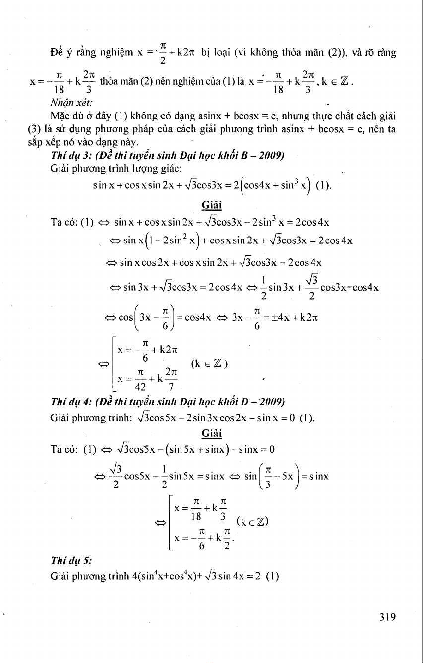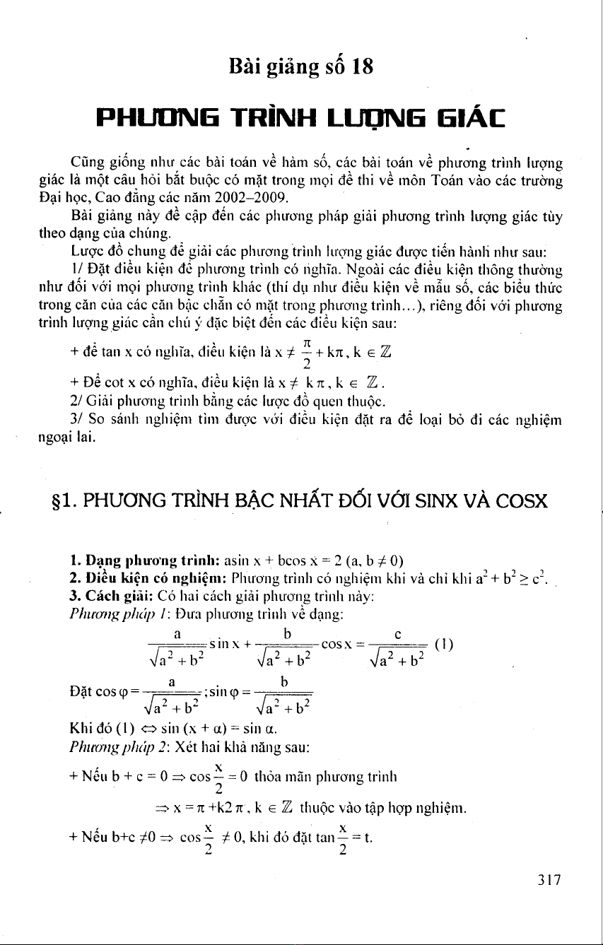 Cũng giống như các bài toán về hàm số, các bài toán về phương trình lượng giác là một câu hỏi bắt buộc có mặt trong mọi đề thi về môn toán vào các trường đại học, cao đẳng các năm 2002-2009. Bài giảng này đề cập đến các phương pháp giải phương trình lượng giác tùy theo dạng của chúng.