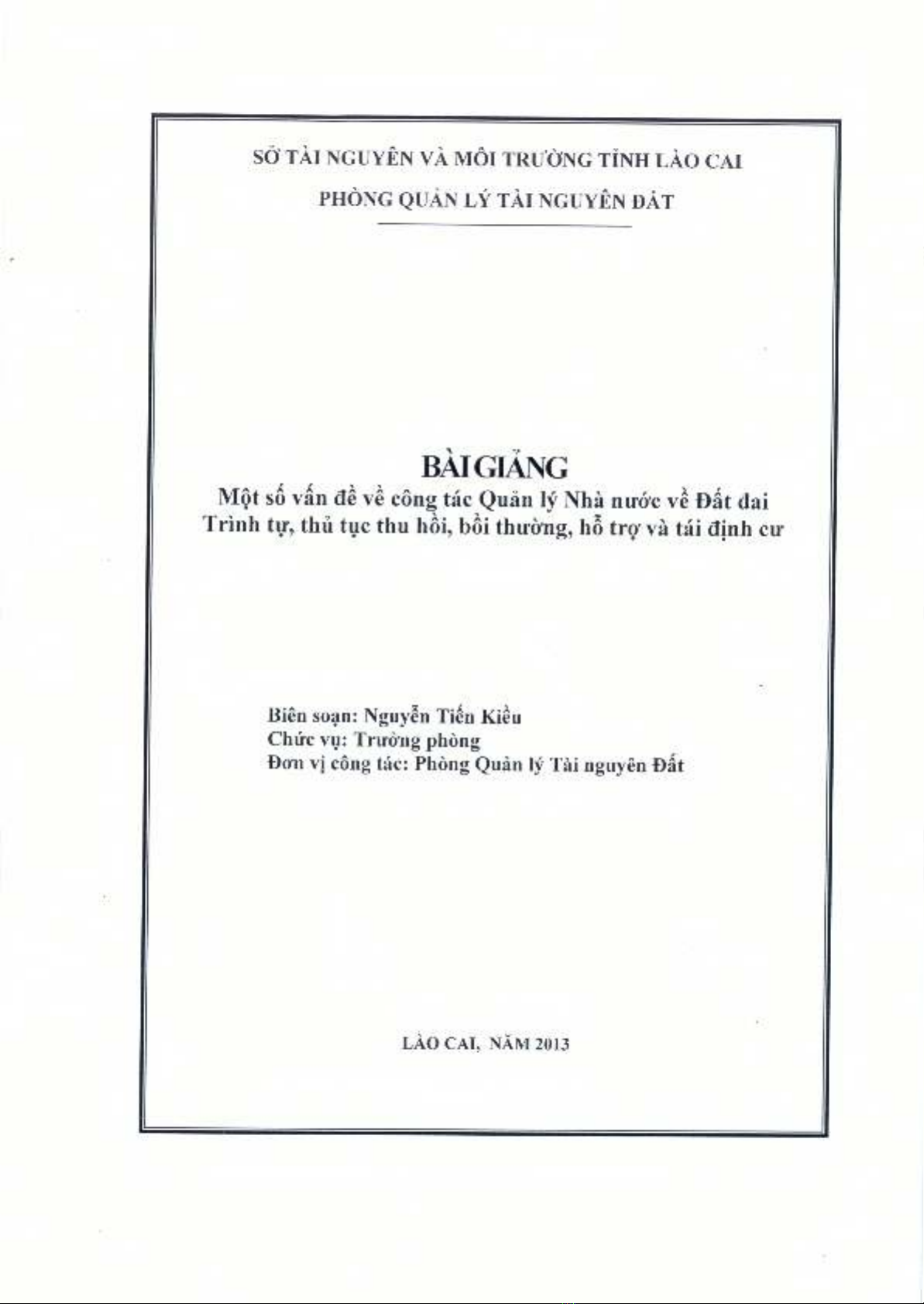 Bài giảng Một số vấn đề về công tác quản lý nhà nước về đất đai, trình tự, thủ tục thu hồi, bồi thường, hỗ trợ và tái định cư