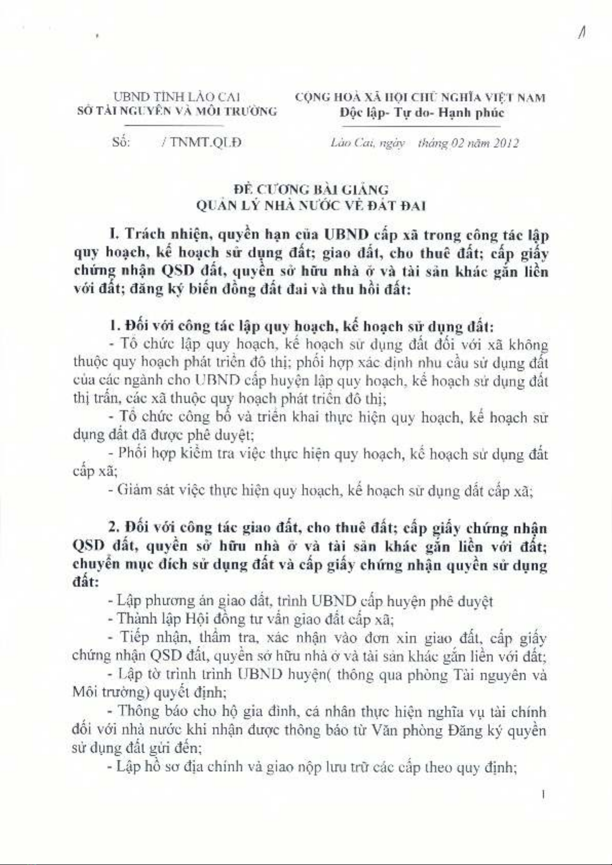 Bài giảng "Một số vấn đề về công tác quản lý nhà nước về đất đai, trình tự, thủ tục thu hồi, bồi thường, hỗ trợ và tái định cư" trình bày về trách nhiệm, quyền hạn của ủy ban nhân dân cấp xã trong công tác lập quy hoạch, kế hoạch sử dụng đất, giao đất, cho thuê đất, cấp giấy chứng nhận quyền sử dụng đất, quyền sử dụng nhà ở và tài sản khác gắn liền với đất, đăng ký biến động đất đai và thu hồi đất,...