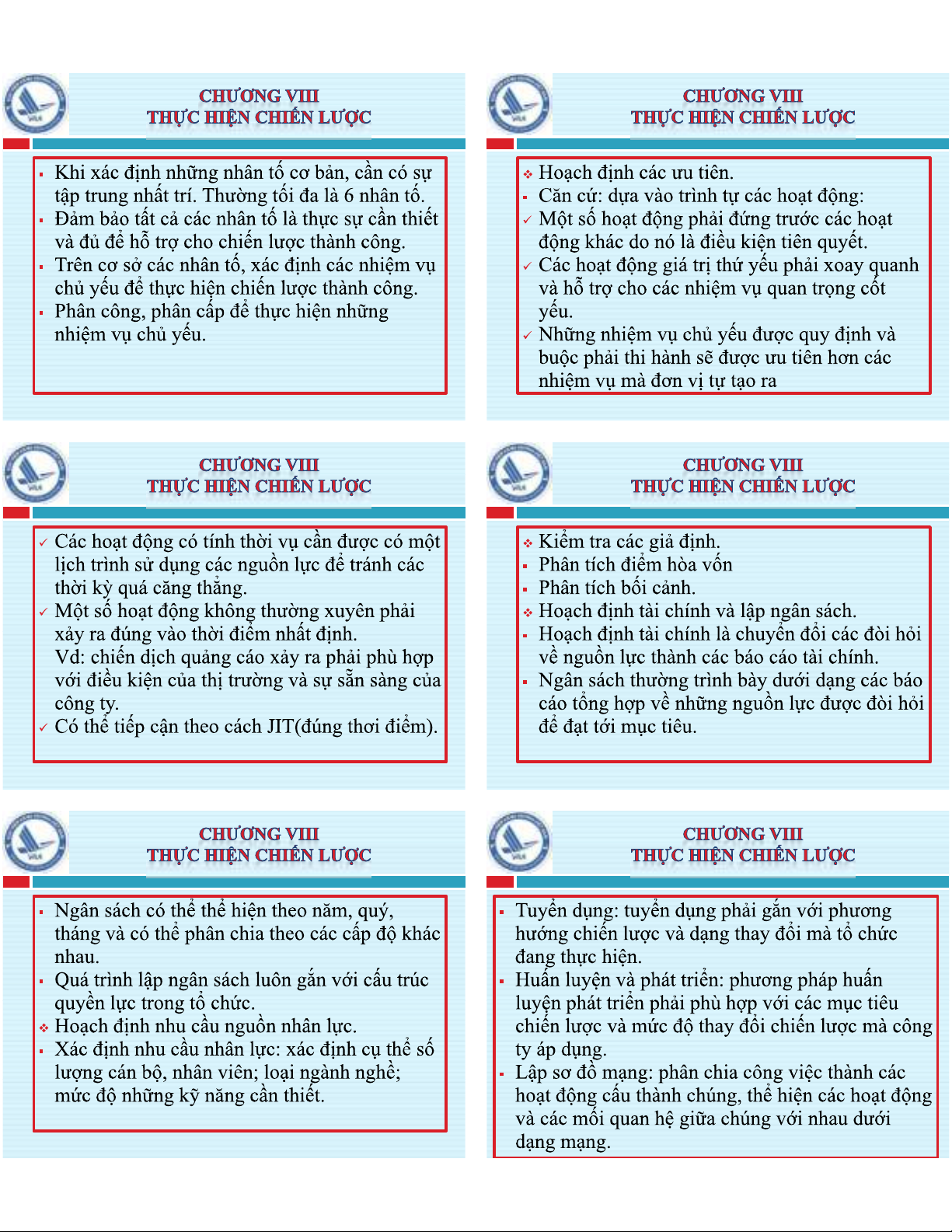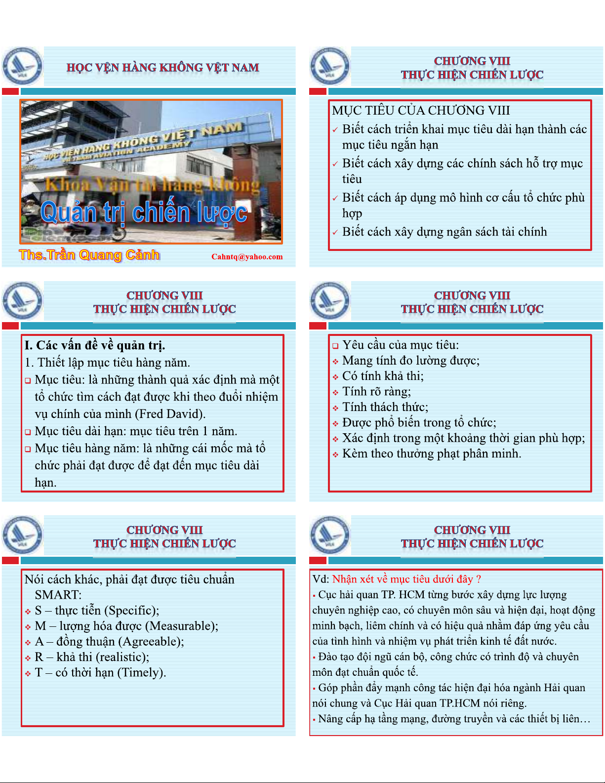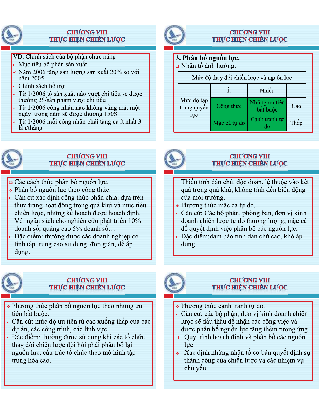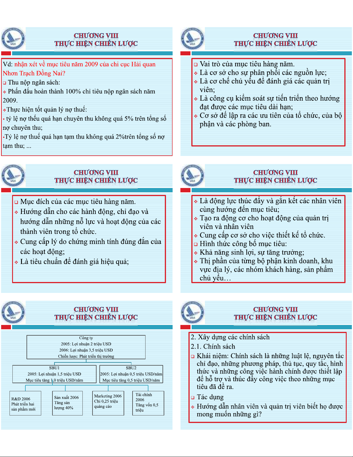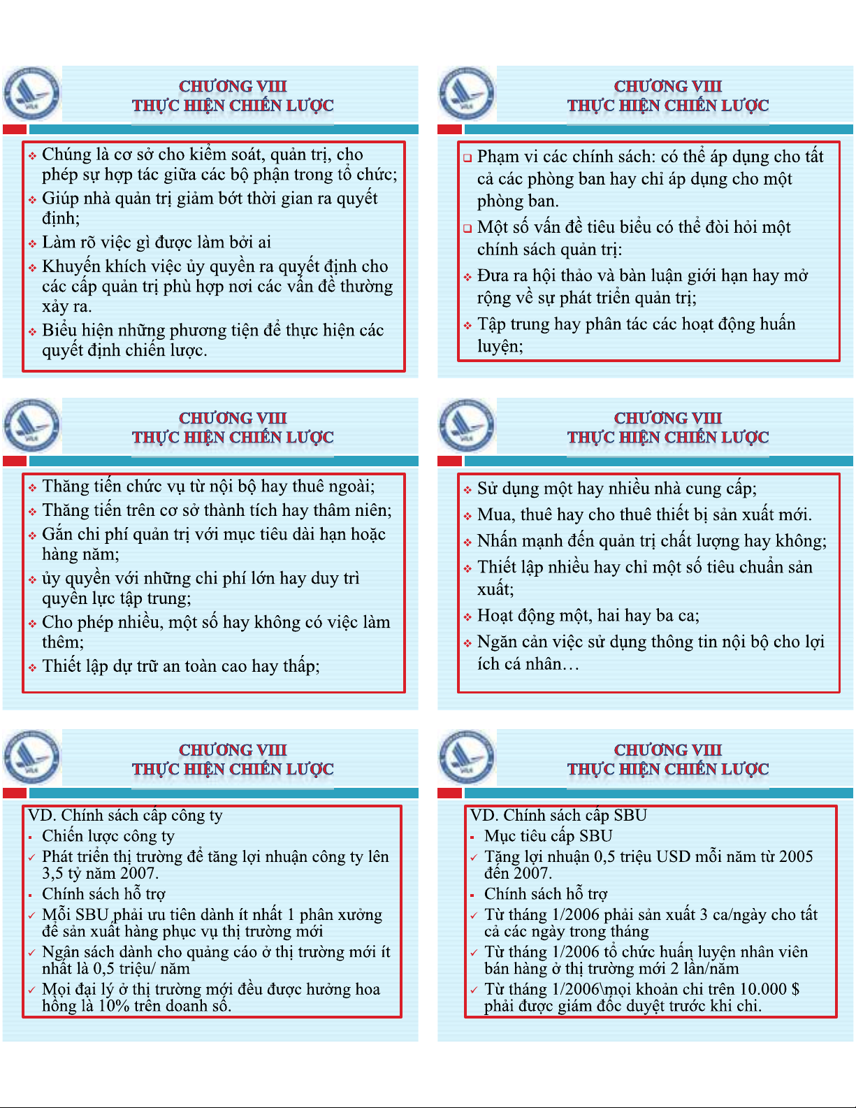 Bài giảng "Quản trị chiến lược - Chương 11: Thực hiện chiến lược" giúp người học hiểu cách triển khai mục tiêu dài hạn và ngắn hạn, biết cách xây dựng các chính sách hỗ trợ mục tiêu, biết cách áp dụng mô hình cơ cấu tổ chức phù hợp,... Mời các bạn cùng tham khảo.