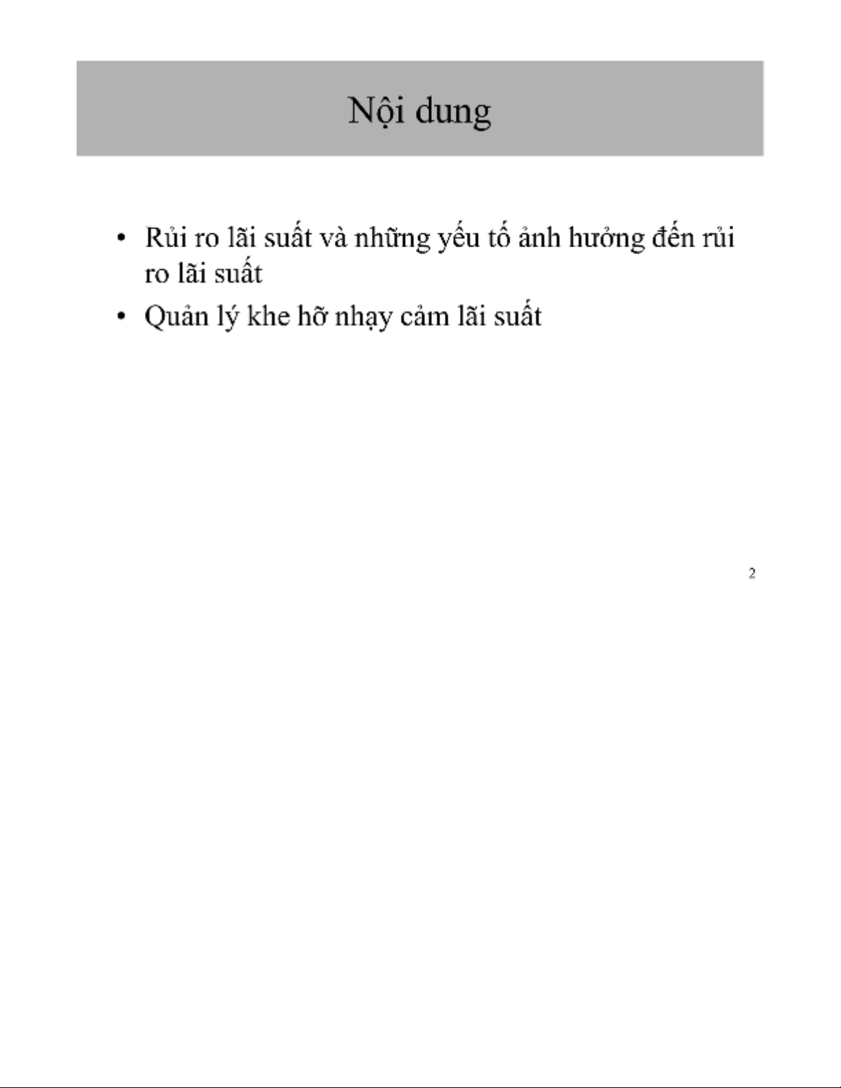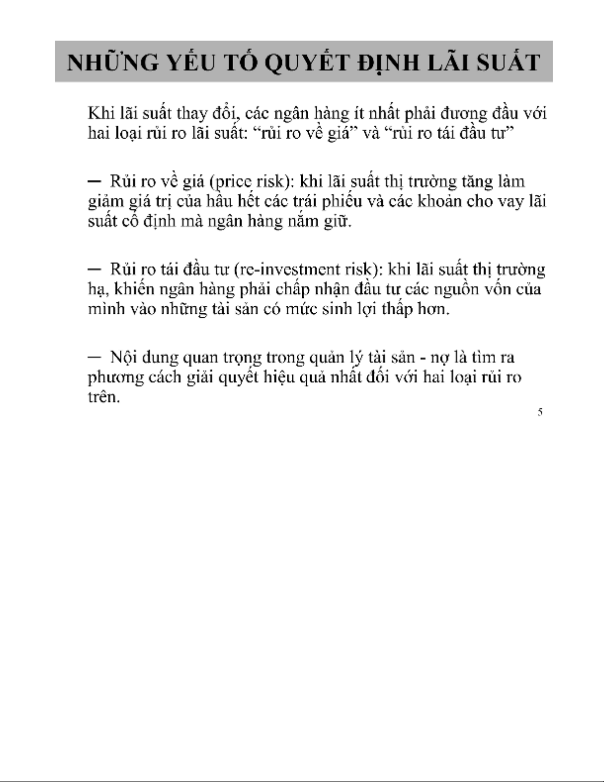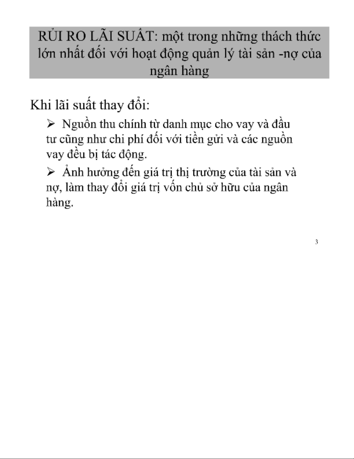 Rủi ro lãi suất là một trong những thách thức lớn nhất đối với hoạt động quản lý tài sản-nợ của ngân hàng. Khi lãi suất thay đổi: Nguồn thu chính từ danh mục cho vay và đầu tư cũng như chi phí đối với tiền gửi và các nguồn vay đều bị tác động. Ảnh hưởng đến giá trị thị trường của tài sản ....