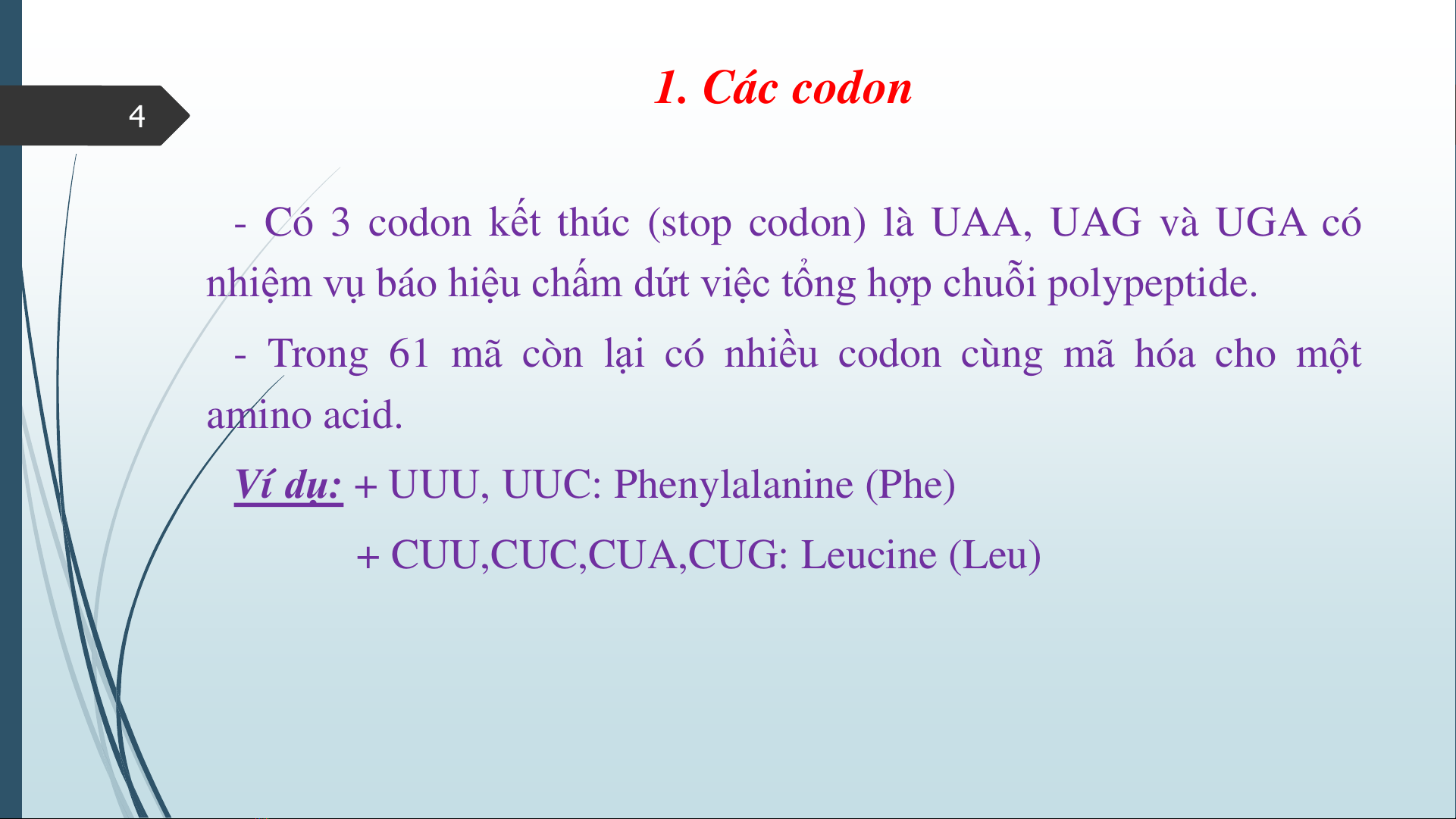 -Có 3 codon kết thúc (stop codon) là UAA, UAG và UGA có