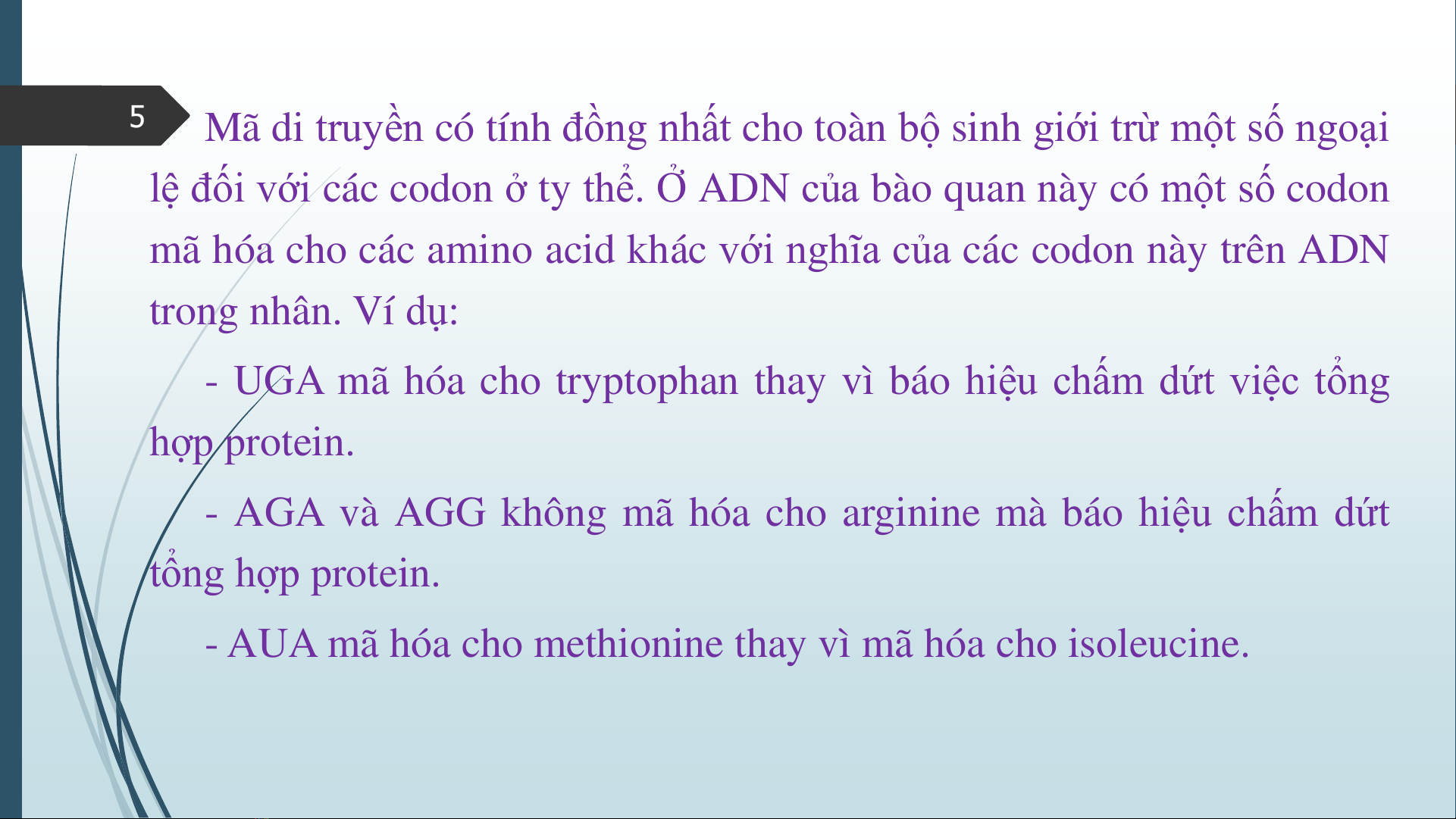 lệ đối với các codon ởty thể.ỞADN của bào quan này có một số codon