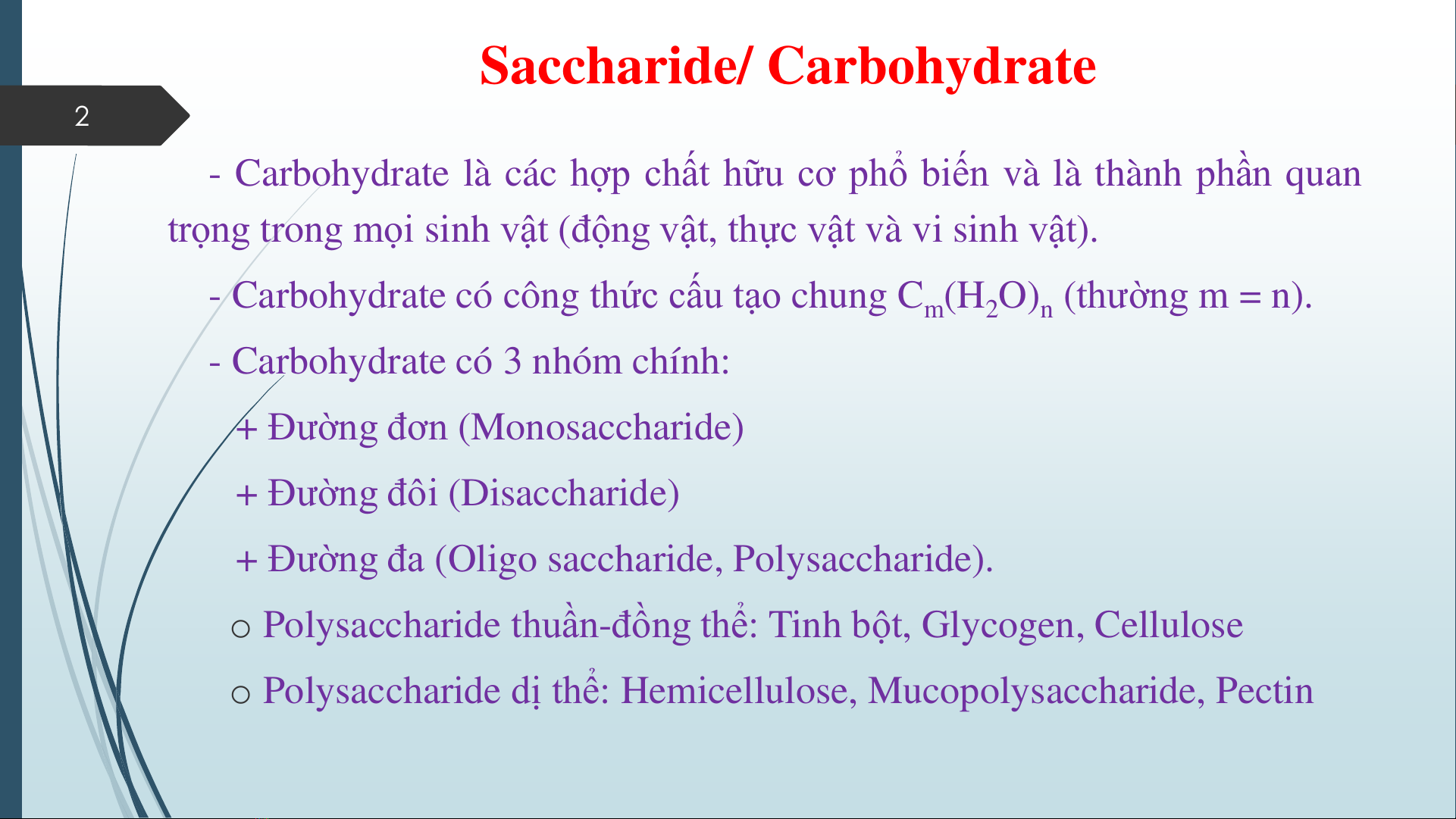 - Carbohydrate là các hợp chất hữu cơ phổ biến và là thành phần quan