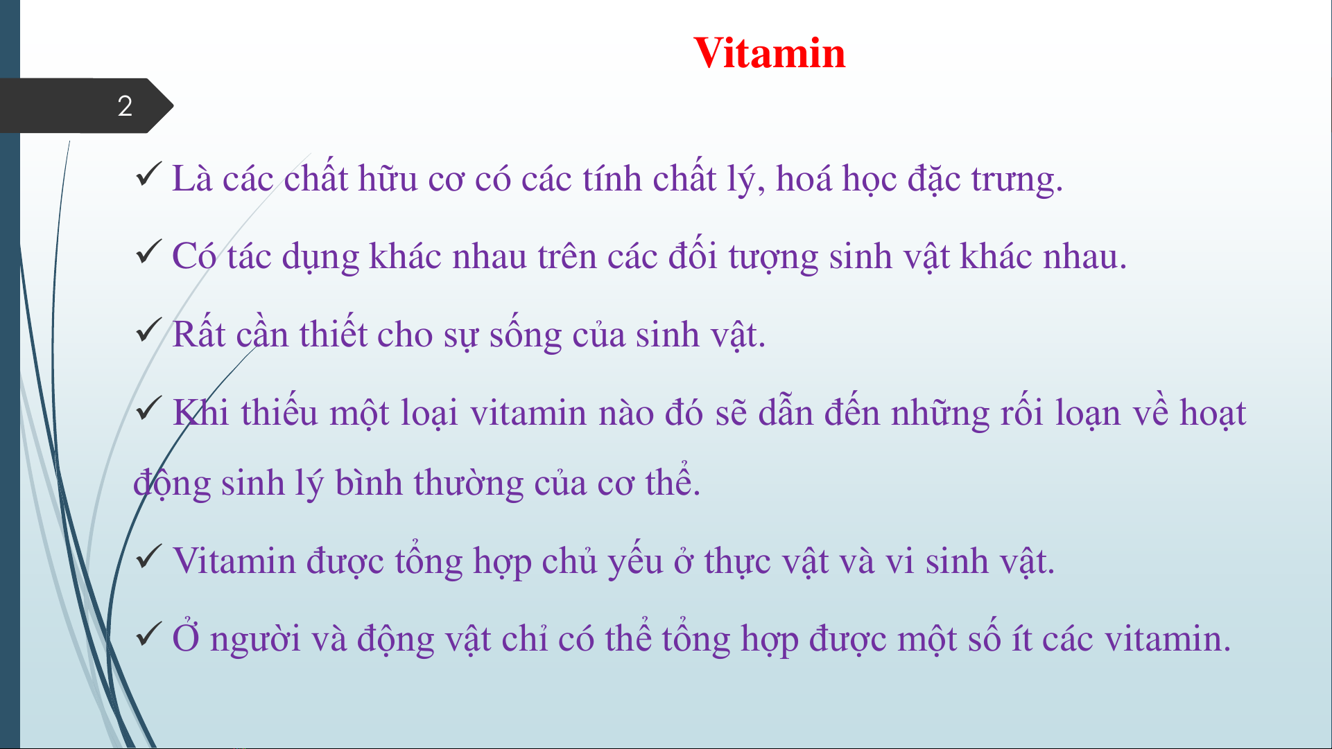 Vitamin được tổng hợp chủ yếu ở thực vật và vi sinh vật.