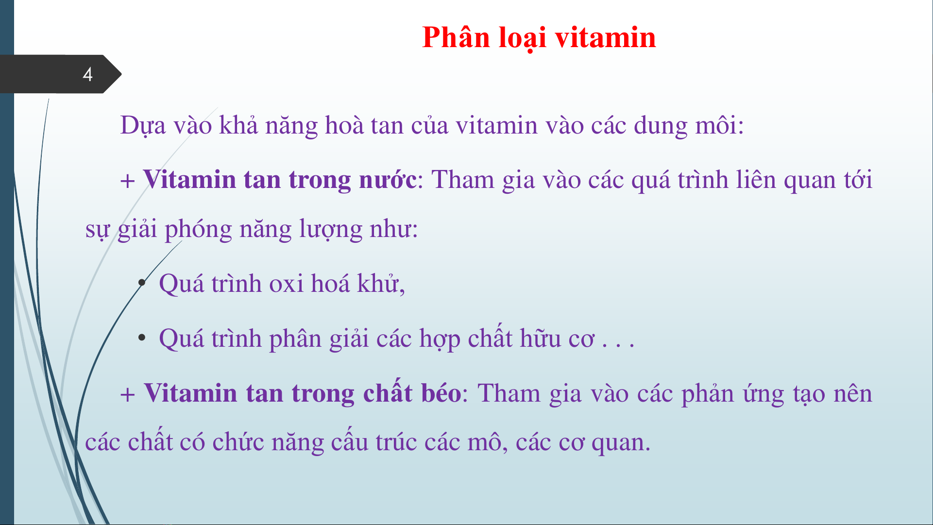 Dựa vào khả năng hoà tan của vitamin vào các dung môi: