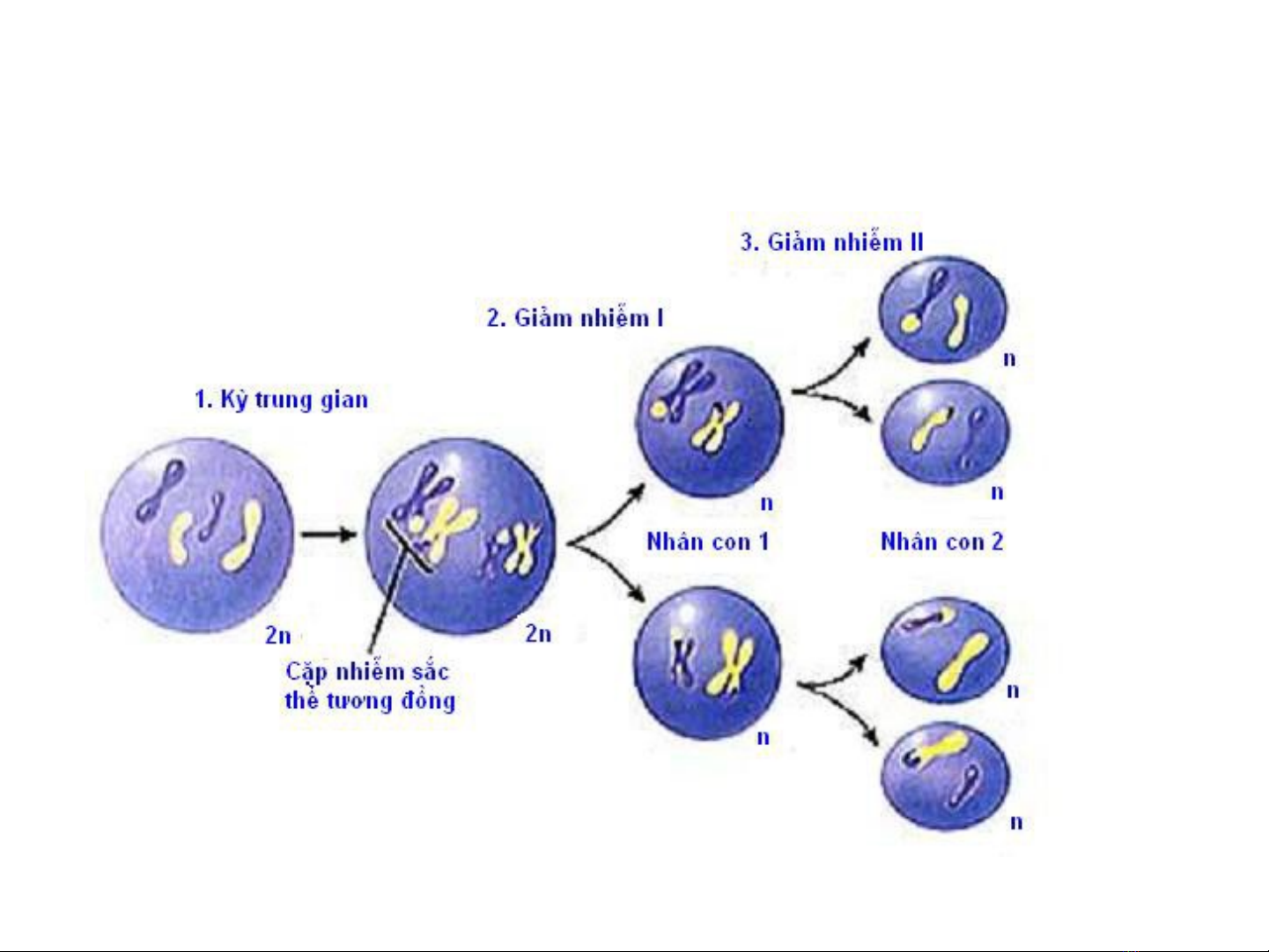 có bộ NST bằng ½ bộ NST của TB mẹ. Gồm 2 lần phân bào