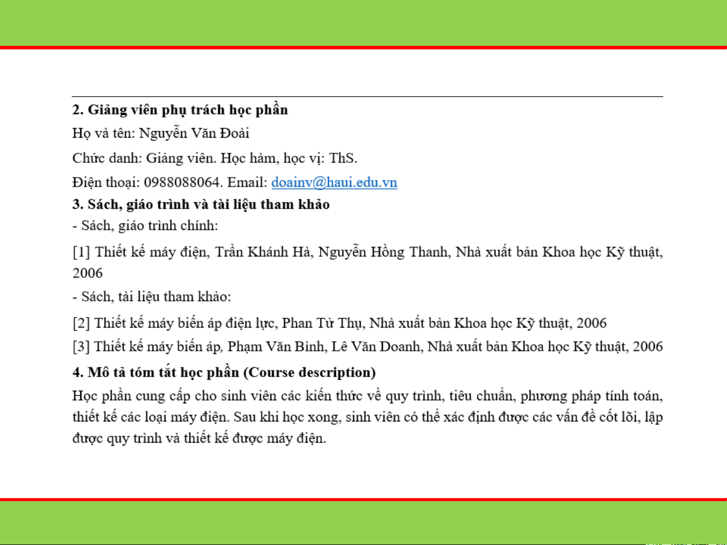 Tài liệu này là một bài giảng chi tiết và hướng dẫn toàn diện dành cho sinh viên ngành Kỹ thuật Điện tại Trường Đại học Công nghiệp Hà Nội, đặc biệt là những người tham gia học phần Thiết kế máy điện (mã học phần EE6110). Nội dung bao gồm đề cương chi tiết học phần, các chuẩn đầu ra cần đạt được, và quy định đánh giá. Trọng tâm của tài liệu là cung cấp kiến thức chuyên sâu về quy trình, tiêu chuẩn và phương pháp tính toán trong thiết kế các loại máy điện, bao gồm máy biến áp và động cơ không đồng bộ. Hơn nữa, tài liệu đóng vai trò như một cẩm nang thực hành, hướng dẫn sinh viên cách thức xây dựng và trình bày các báo cáo, tiểu luận, bài tập lớn và đồ án môn học một cách chuẩn mực. Các phần quan trọng khác bao gồm việc giới thiệu các tiêu chuẩn kỹ thuật quốc gia (TCVN) và quốc tế (IEC) áp dụng cho máy điện, các quy định về định dạng văn bản (font chữ, lề, giãn dòng, cách trình bày hình ảnh, bảng biểu, tài liệu tham khảo) theo Quyết định 815 của trường. Tài liệu cũng chỉ ra những lỗi phổ biến mà sinh viên thường mắc phải trong quá trình thực hiện và trình bày, nhằm giúp sinh viên tránh các sai sót và đảm bảo chất lượng công trình học thuật của mình. Mục tiêu cuối cùng là trang bị cho sinh viên năng lực thiết kế máy điện và kỹ năng trình bày khoa học, chuyên nghiệp.