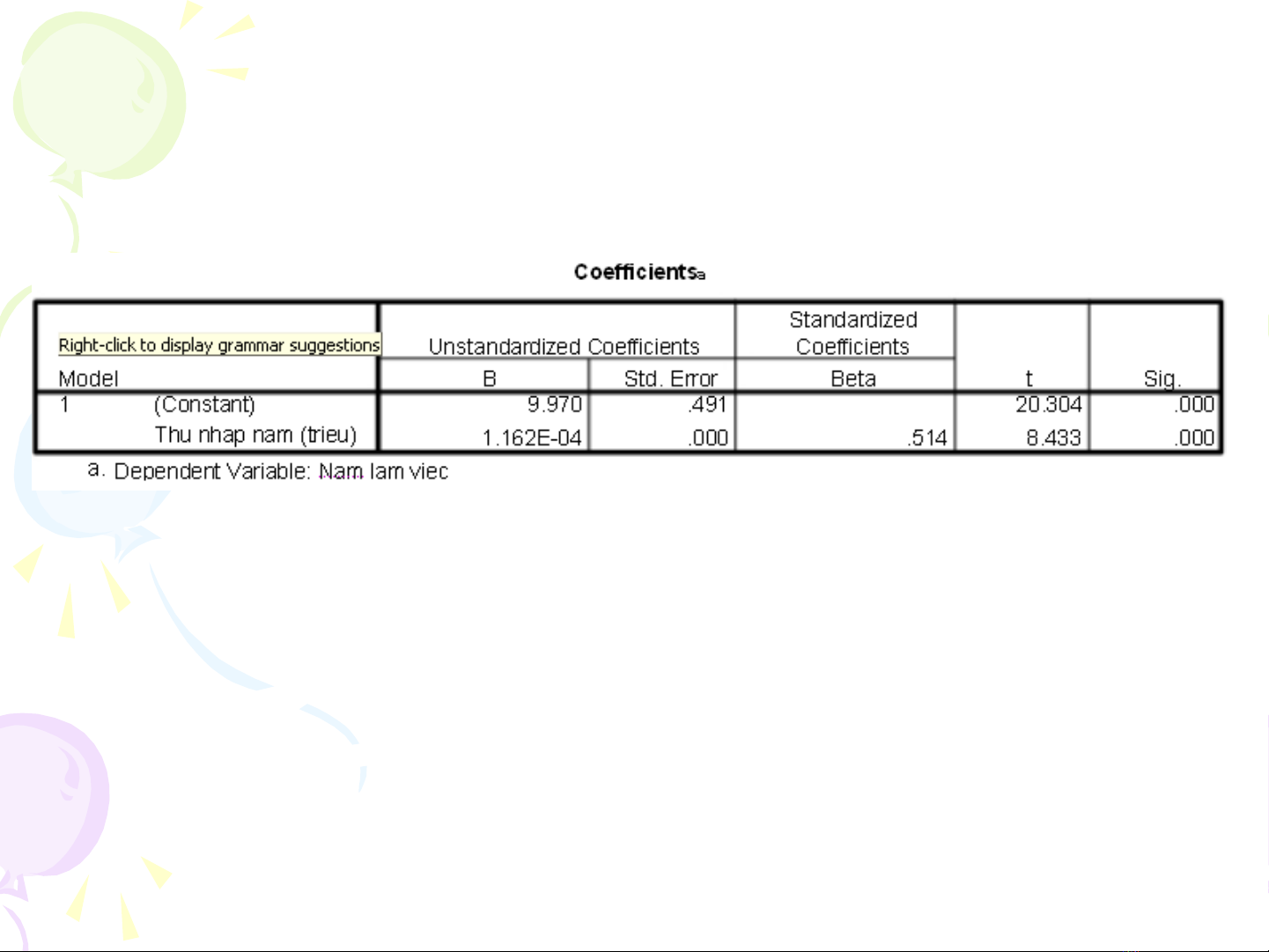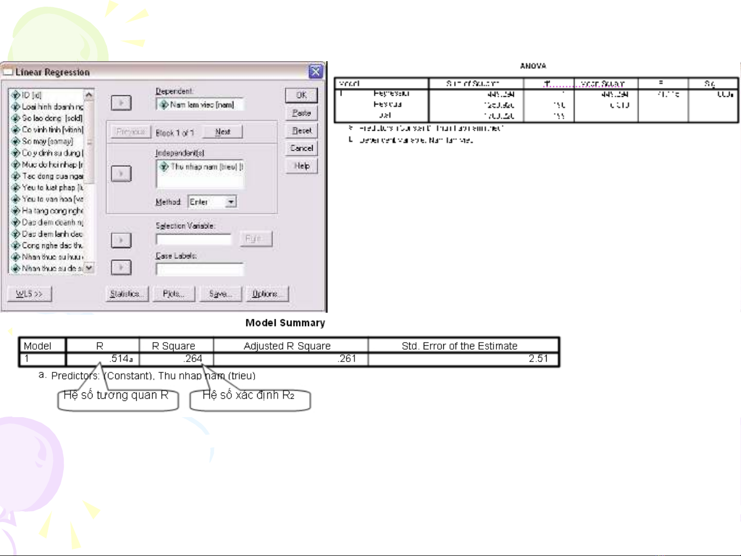 R2 = 0,264 có nghĩa là bi n s năm làm vi c s gi i thích 26,4% thu nh p/ năm c a ế ố ệ ẽ ả ậ ủ