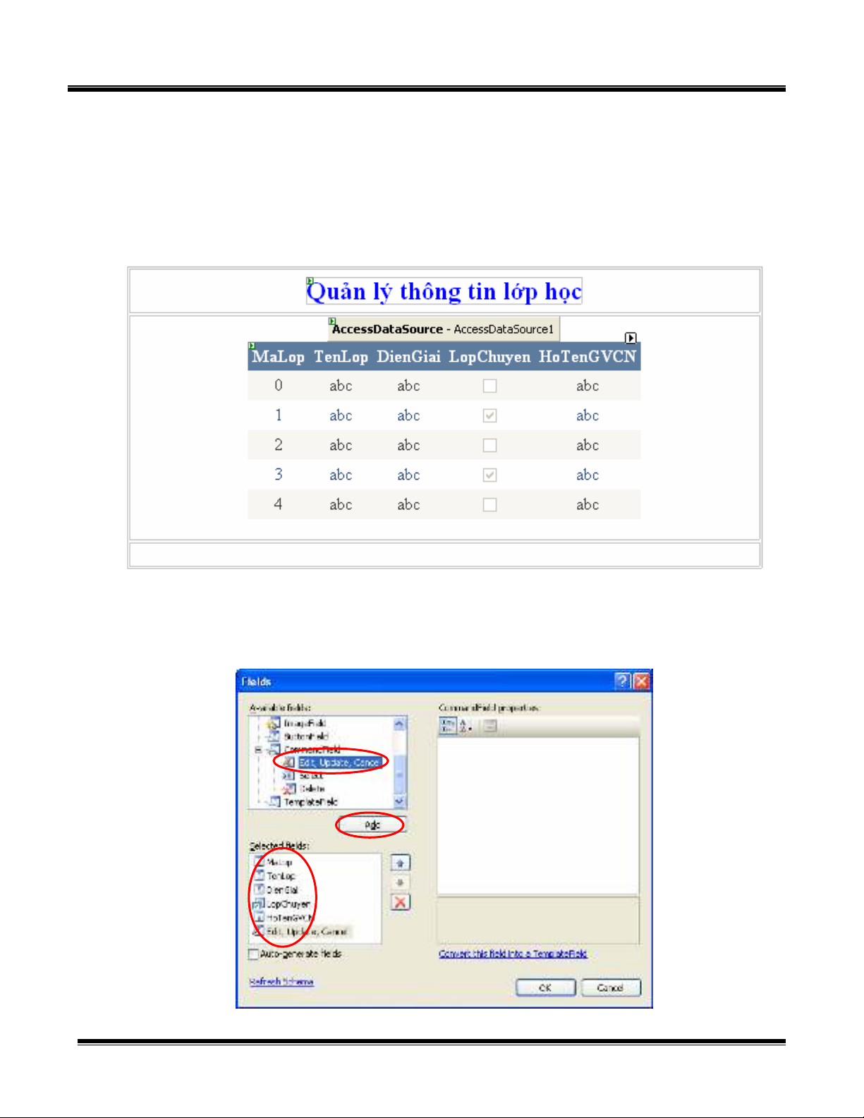 1. Trong Selected fields có sẵn 5 cột, thêm vào cột Edit, Update, Cancel