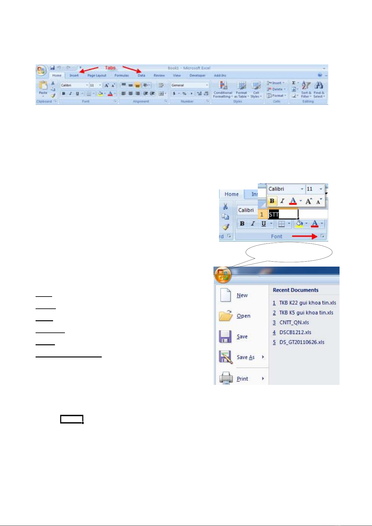 Nút Office Button thực thi các chức năng: Tạo một workbook mới (New), mở một