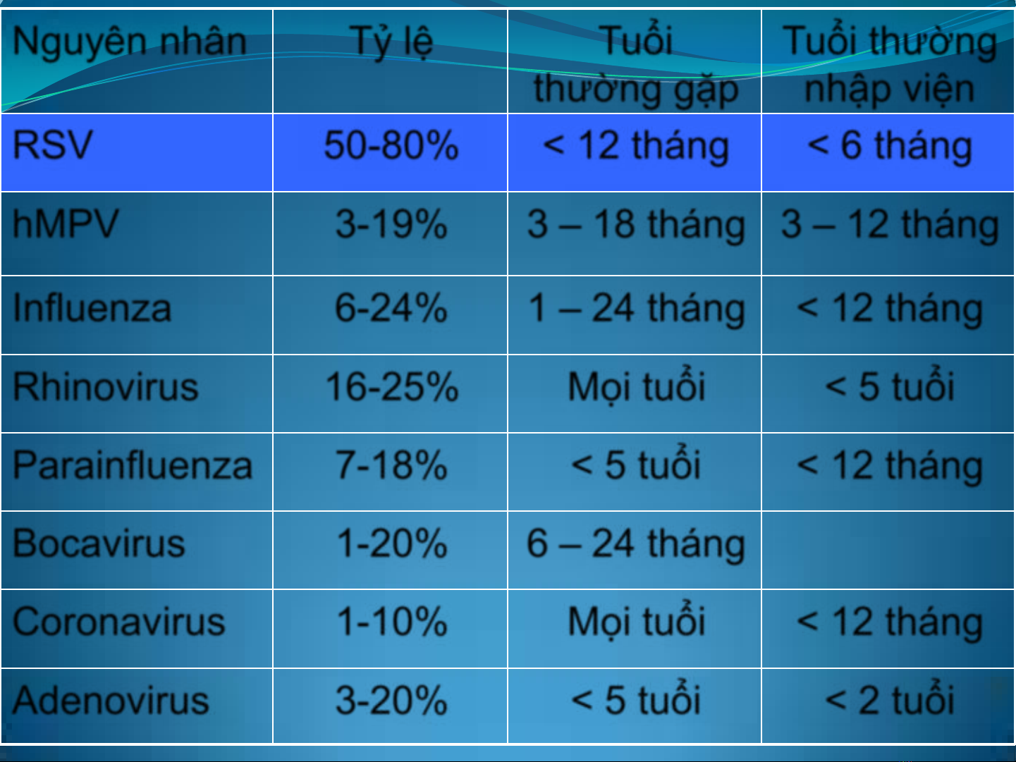 Rhinovirus 16-25% Mọi tuổi < 5 tuổi
