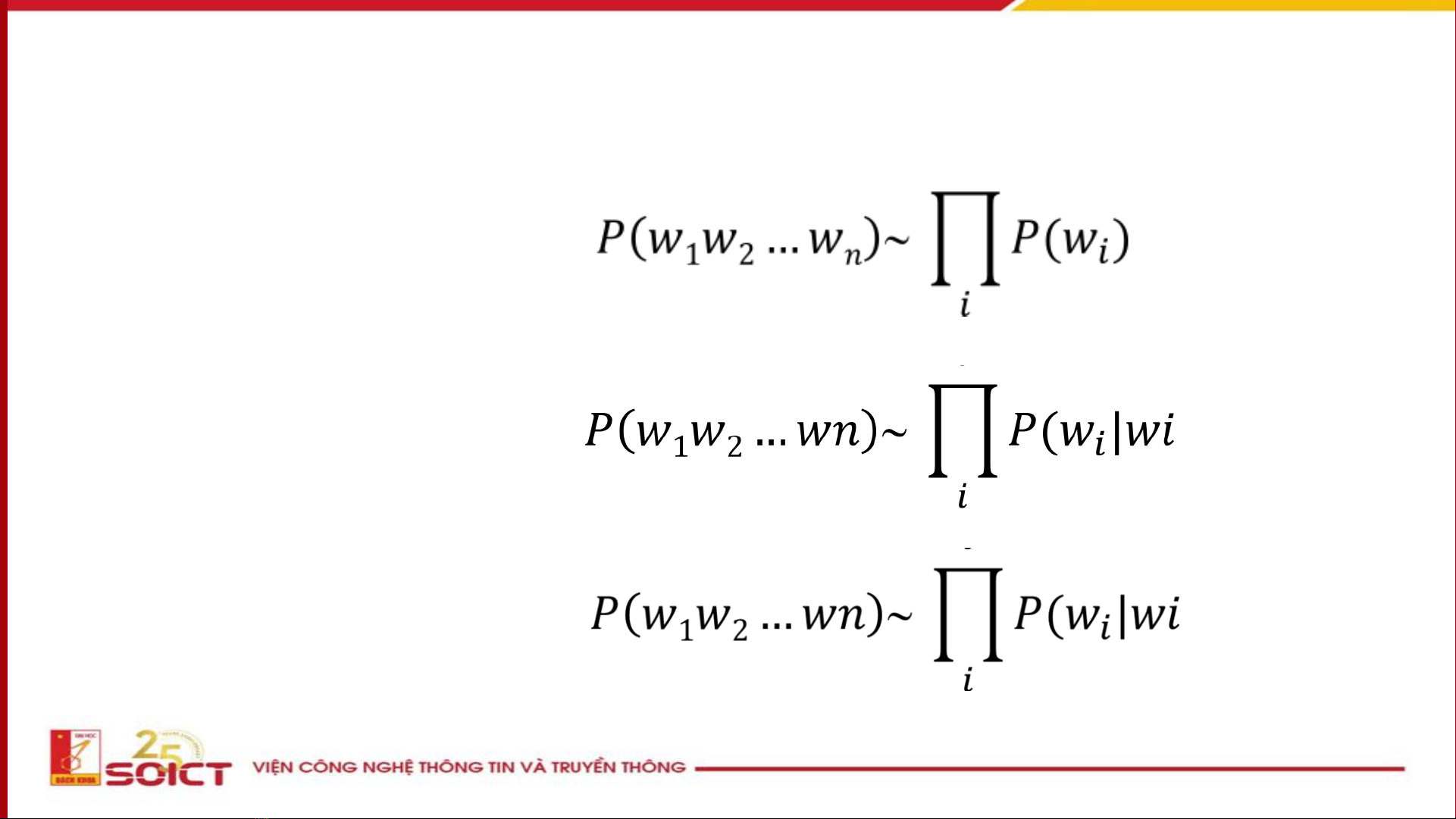 • vd: P(“hôm nay trời đẹp”) > P(“trời đẹp nay hôm”)